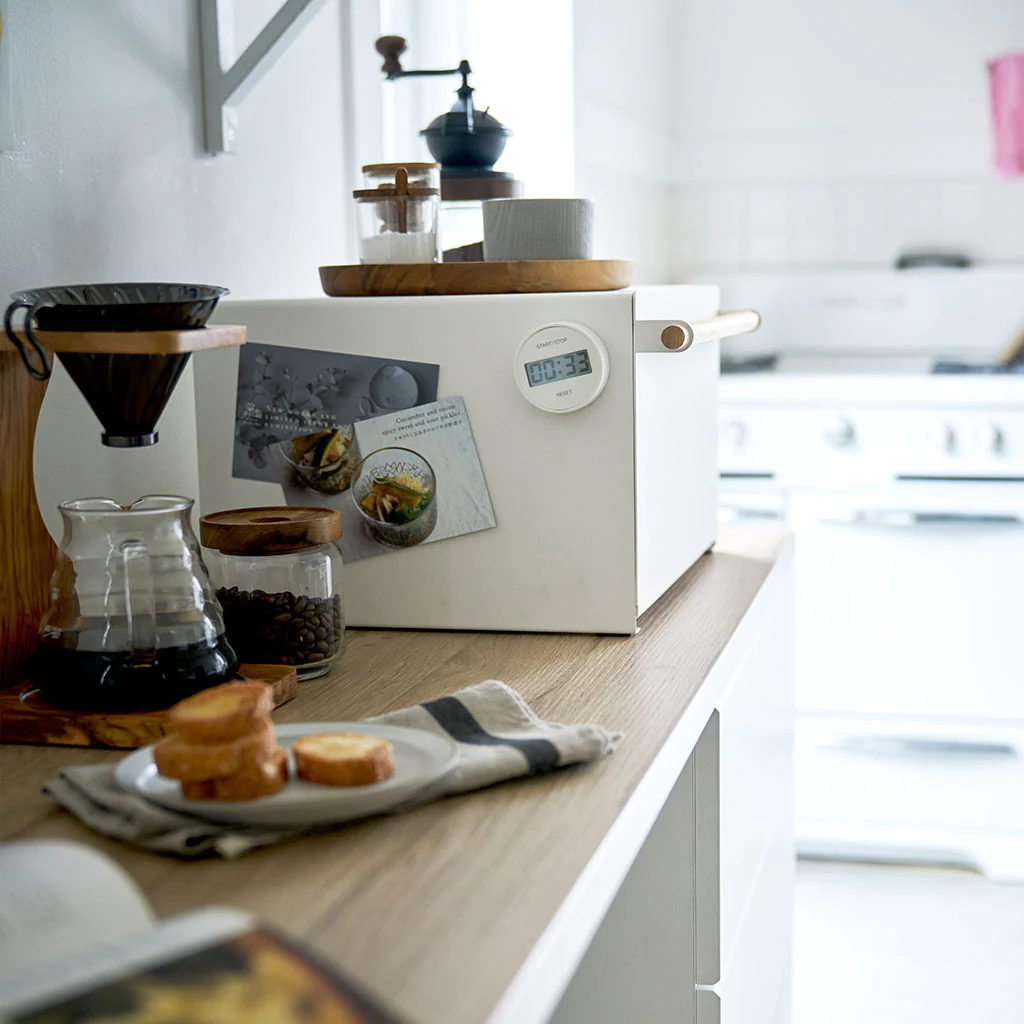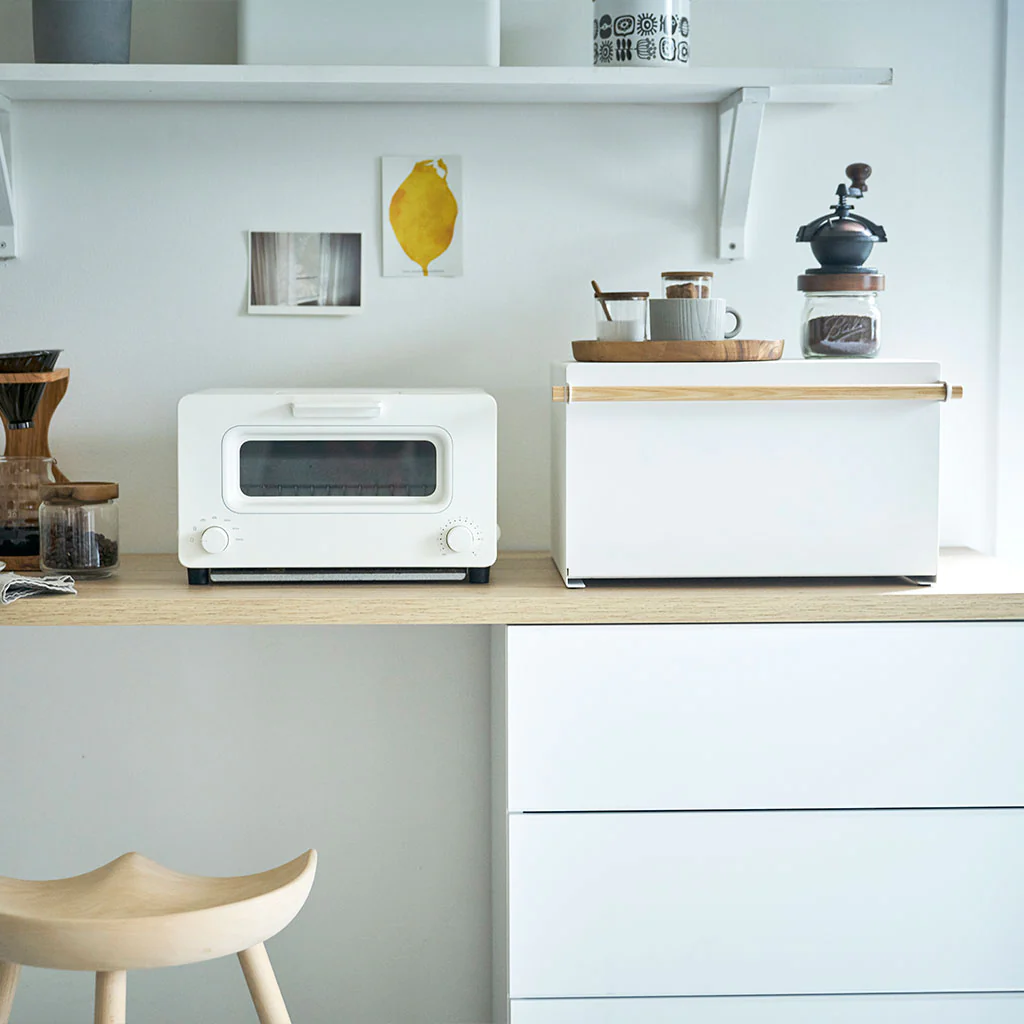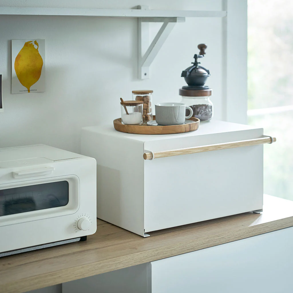 La Caja de Pan y Almacenamiento Tosca Yamazaki es el complemento ideal para mantener tu cocina organizada y tus panes frescos por más tiempo. Con la combinación del metal blanco y la calidez de la madera, ofrece un diseño elegante y moderno; además, esta caja no solo conserva el pan, sino que también ofrece espacio para guardar frascos de mermeladas y otros ingredientes, convirtiéndola en un armario secundario en la cocina.