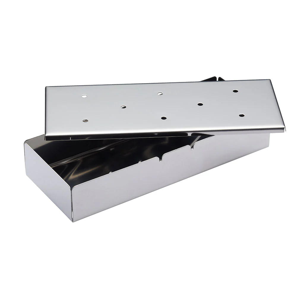 Esta caja de acero inoxidable cuenta con una tapa perforada con ocho orificios, por donde el humo se escapa y reparte el aroma y sabor a los alimentos. Un complemento ideal para tu barbacoa o para el horno.