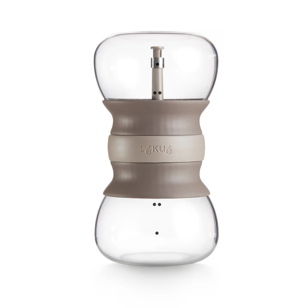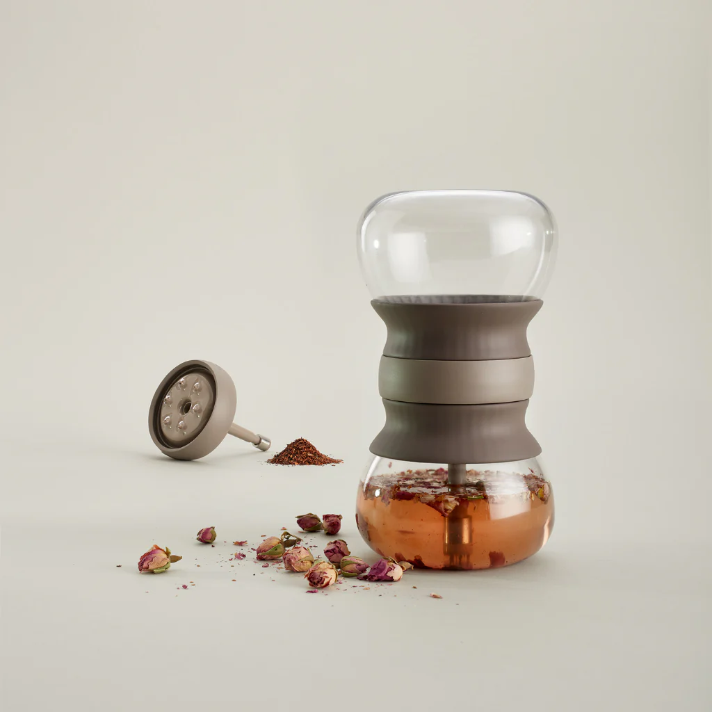 El infusor tiene una capacidad que te permite preparar hasta dos tazas. Está formado por dos jarras de vidrio de borosilicato aptas para microondas y un filtro desmontable, compuesto por una válvula que permite el filtraje y un goteador que recrea el efecto lluvia para conseguir la infusión. Sentirás que el tiempo fluye a un ritmo más relajado.