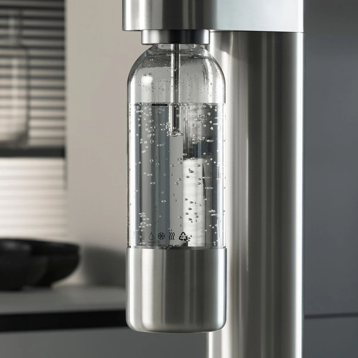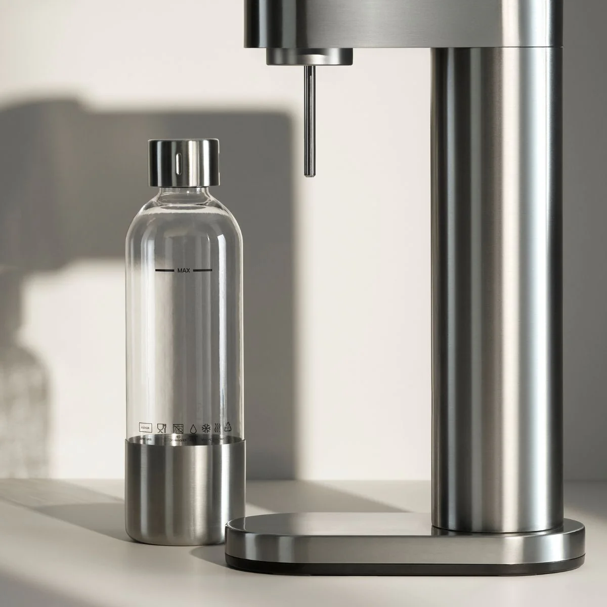 Fabricada en acero inoxidable Cromargan®, destaca por su robustez, su estética limpia y su tamaño compacto, ideal para mantener siempre a la vista en la encimera. Su funcionamiento con bombonas estándar de CO₂ facilita el uso continuo sin depender de cartuchos exclusivos, y su botella reutilizable hace que el proceso sea más sostenible y práctico en el día a día.