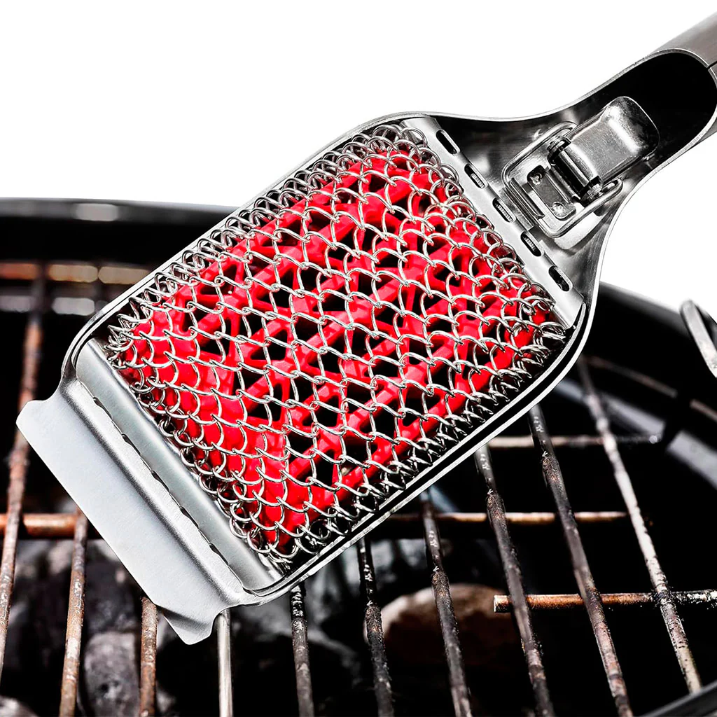 - El raspador tiene un diseño flexible y sin cerdas que limpia a fondo las rejillas frías y calientes de la parrilla.