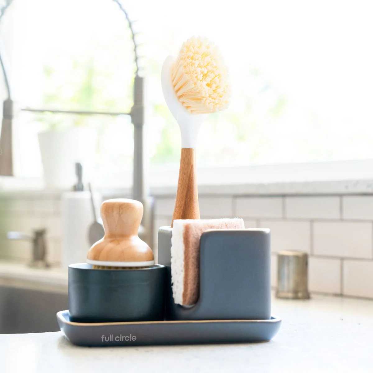 - Cepillo limpiador para vajilla Full Circle + base cerámica para recoger líquidos y mantener el fregadero seco.