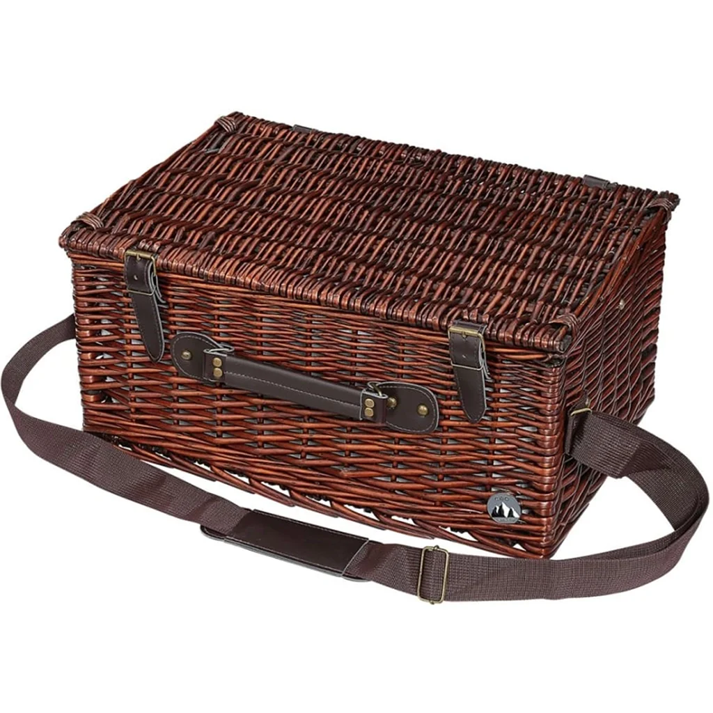 La cesta presenta un elegante acabado en mimbre de alta calidad, en un hermoso tono marrón oscuro. Con sus dimensiones de 46 x 30 x 18 cm, ofrece un amplio espacio para almacenar alimentos y utensilios para hasta 4 personas. Además, cuenta con un práctico sistema de cierre que asegura que todo se mantenga en su lugar durante tu travesía.