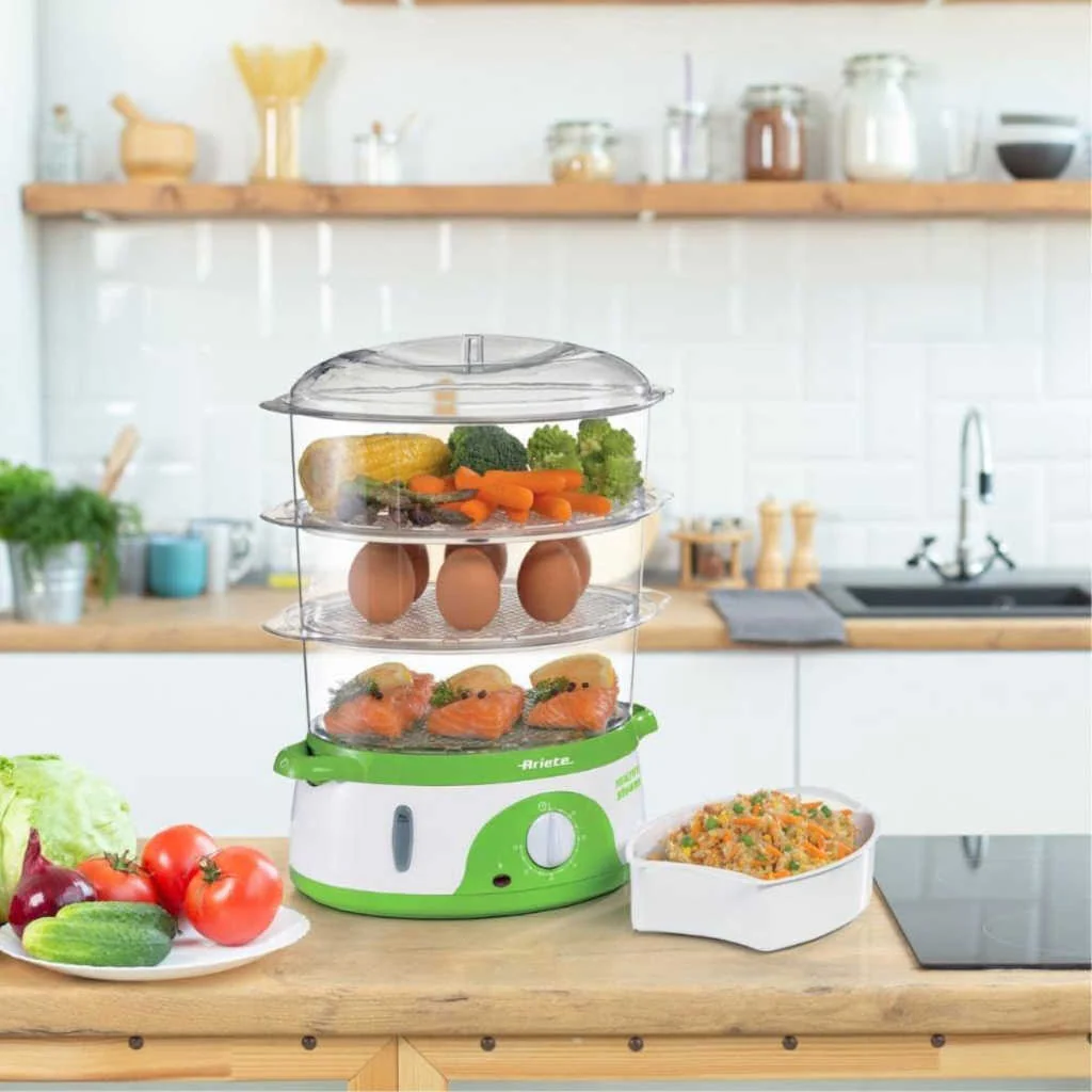 Con su diseño en columna, el Cocedor a vapor de 3 pisos Ariete te permitirá cocinar al vapor hasta tres recetas diferentes, ocupando el mínimo espacio. Esta vaporera eléctrica tiene tres cestas independientes que te facilitarán la cocción de arroz, pescado, verduras, huevos, carnes e incluso frutas, manteniendo todo su sabor y sus nutrientes. Además, podrás ver en todo momento el interior, porque las cestas y la tapa son transparentes.