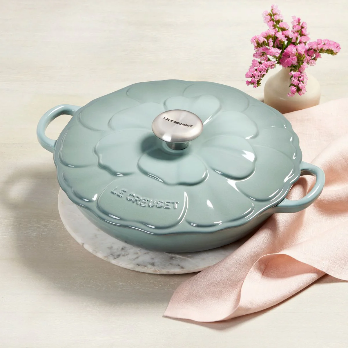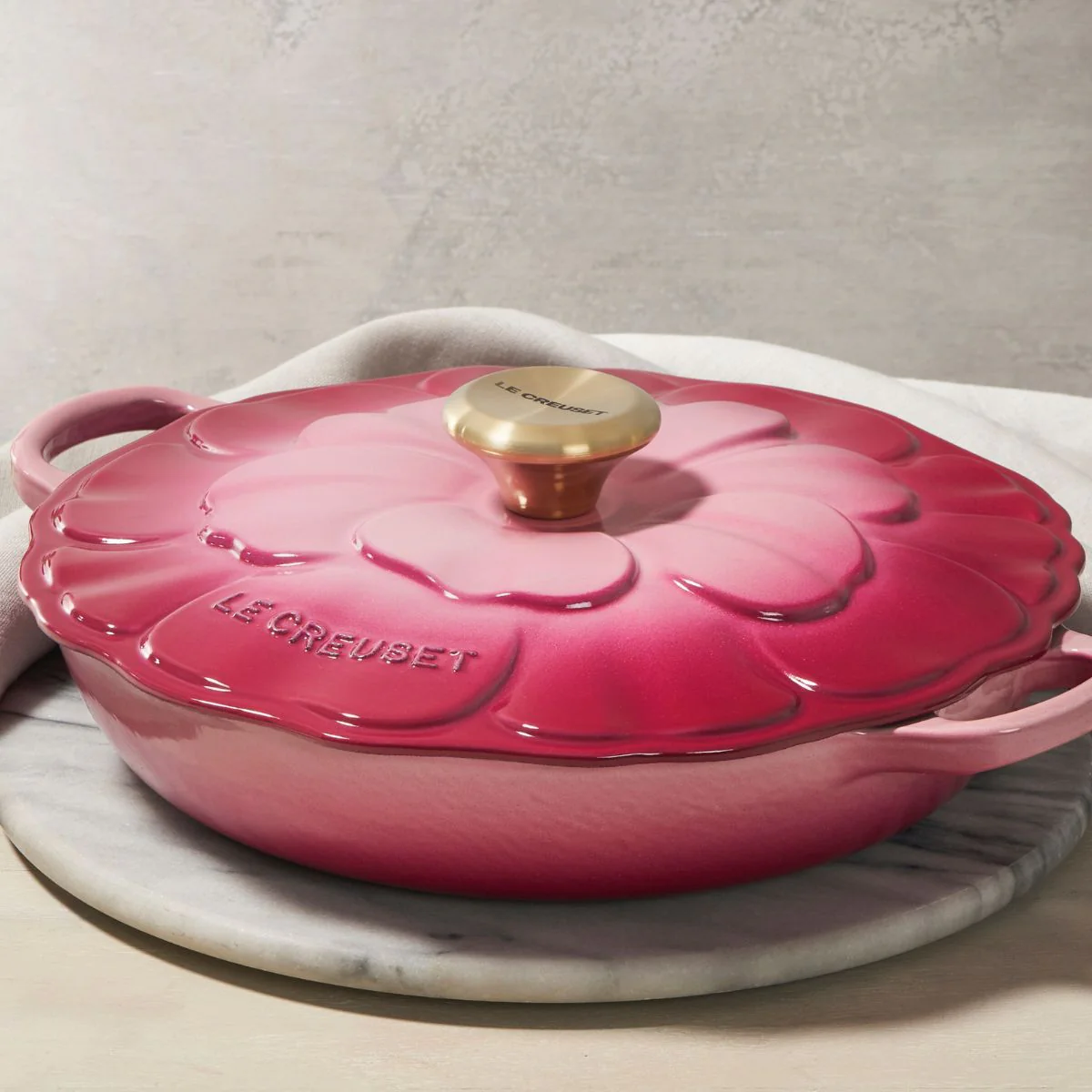 Si te apasiona cocinar y te encanta el resultado de cualquier guiso preparado en cocotte, la Cacerola baja de hierro Pétalo Le Creuset te va a enamorar. Su diseño es pura artesanía, mostrando en el relieve de la tapa los delicados pétalos de la flor de la anémona francesa con gran realismo. Esta cocotte baja de hierro fundido, con su diseño tipo cacerola y su preciosa tapa, es una pieza de colección que no puede faltar en tu cocina y en tu mesa.