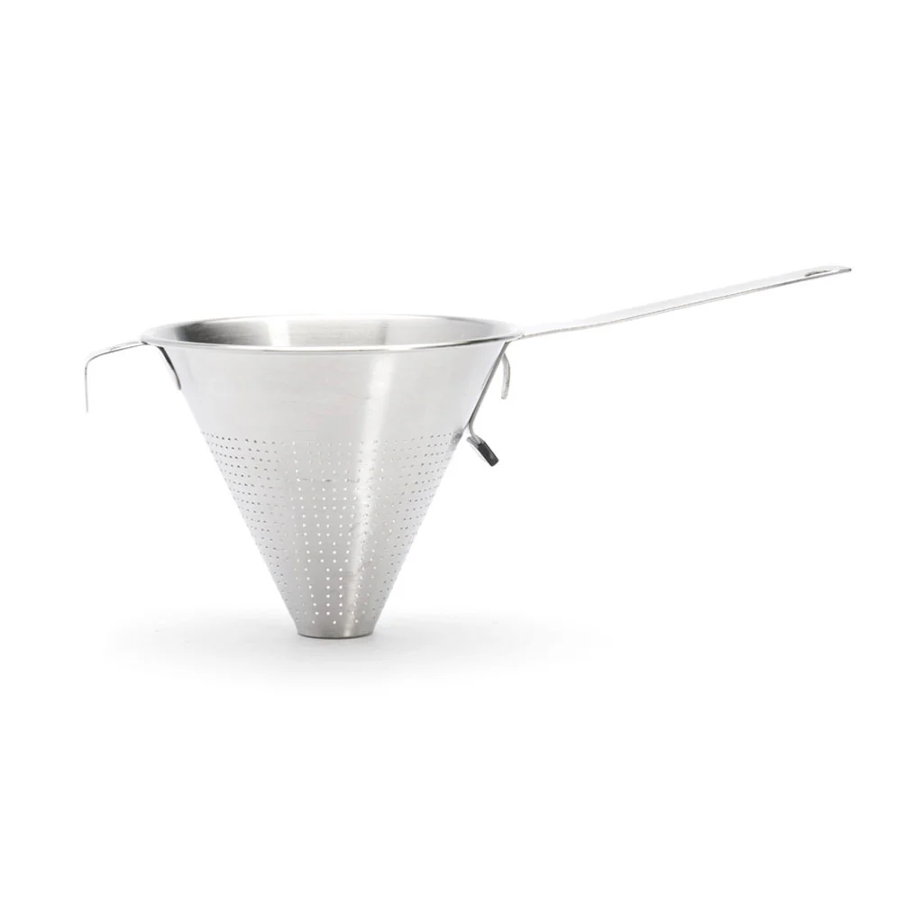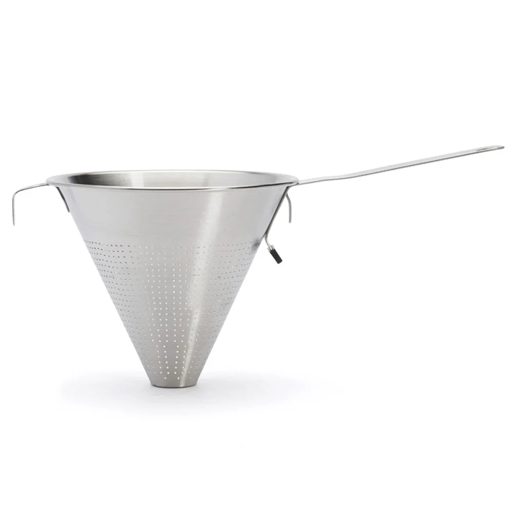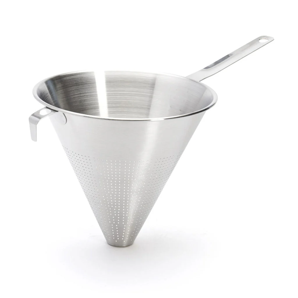 - Colador de acero inoxidable de diseño cónico, tipo «chino».