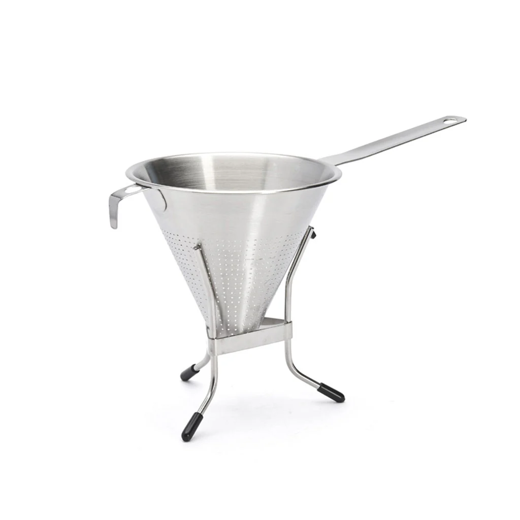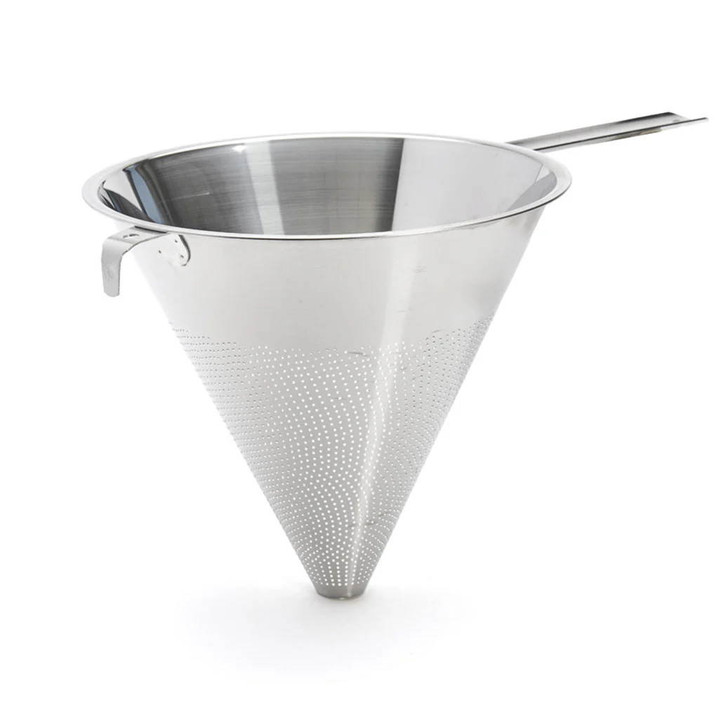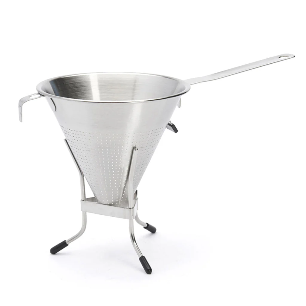 - Colador de acero inoxidable de diseño cónico, tipo «chino».