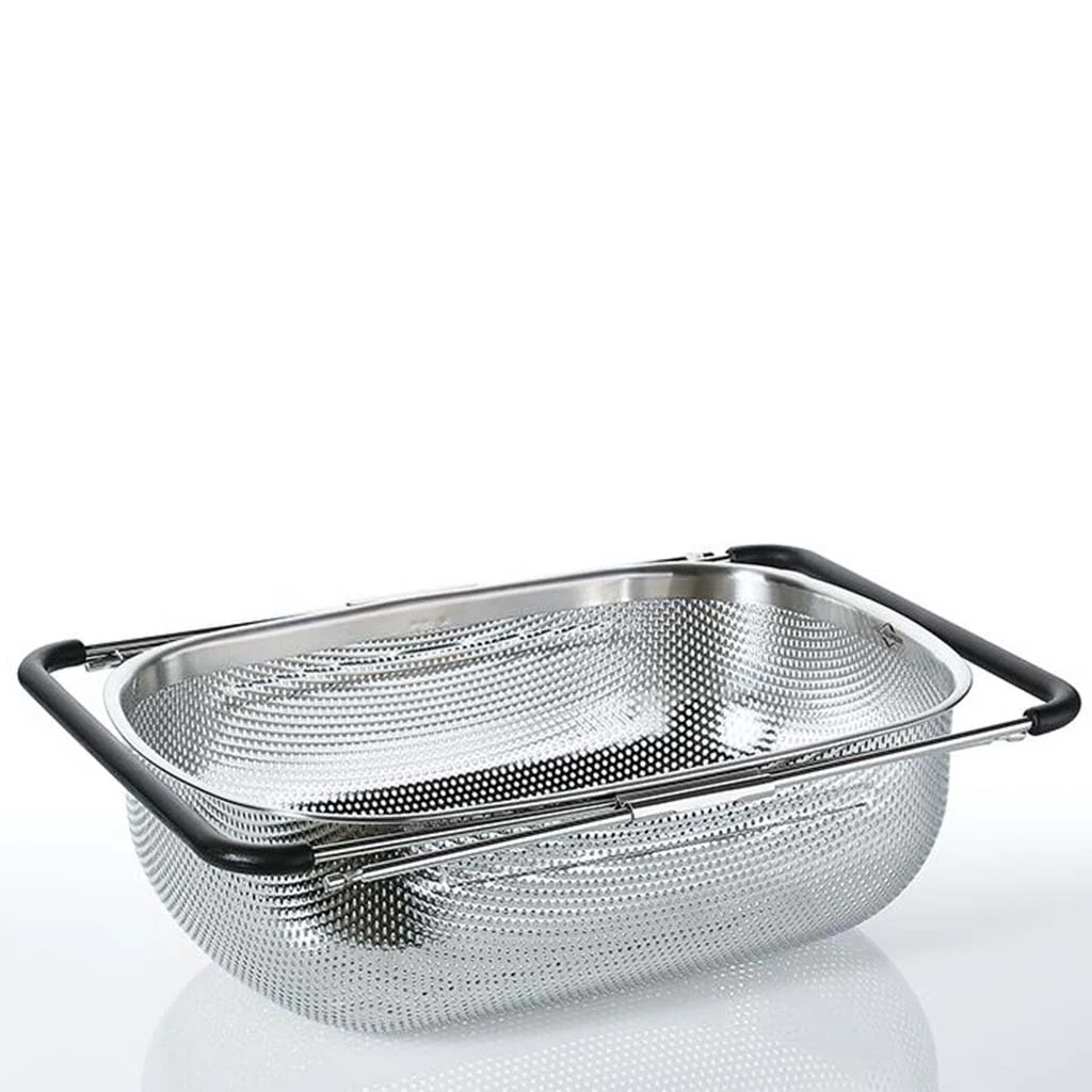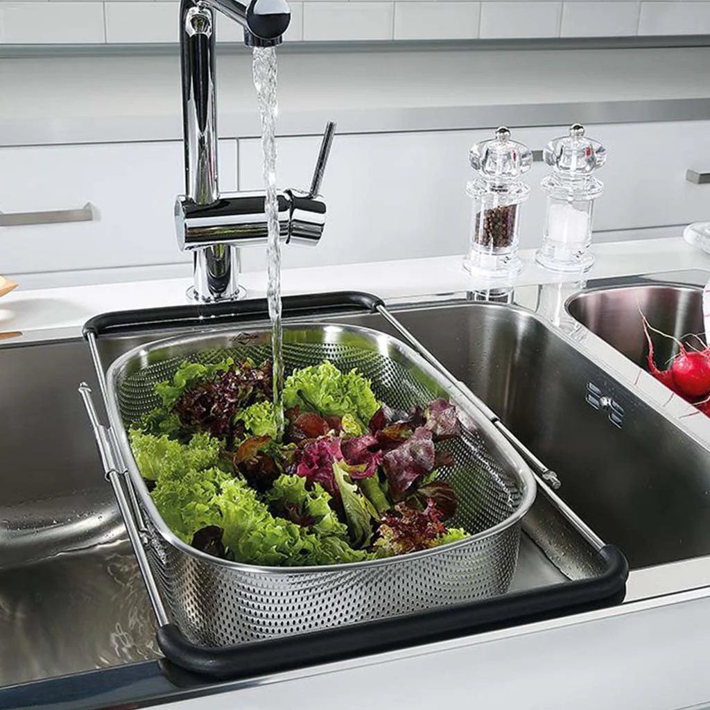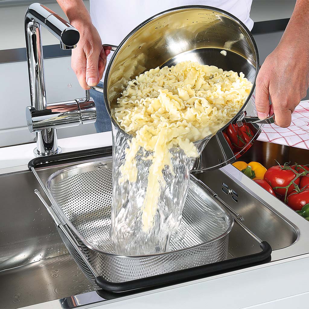 Gracias a sus asas extensibles (34 cm a 58 cm), se adapta a gran parte de los fregaderos de cualquier cocina, ya sea en horizontal o colocado verticalmente en los fregaderos más largos.