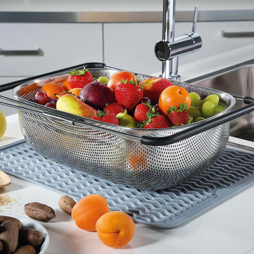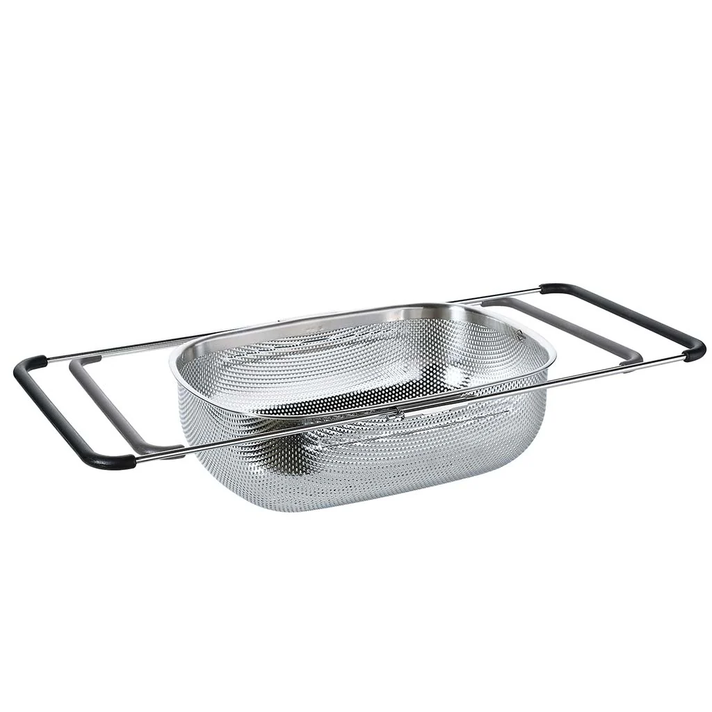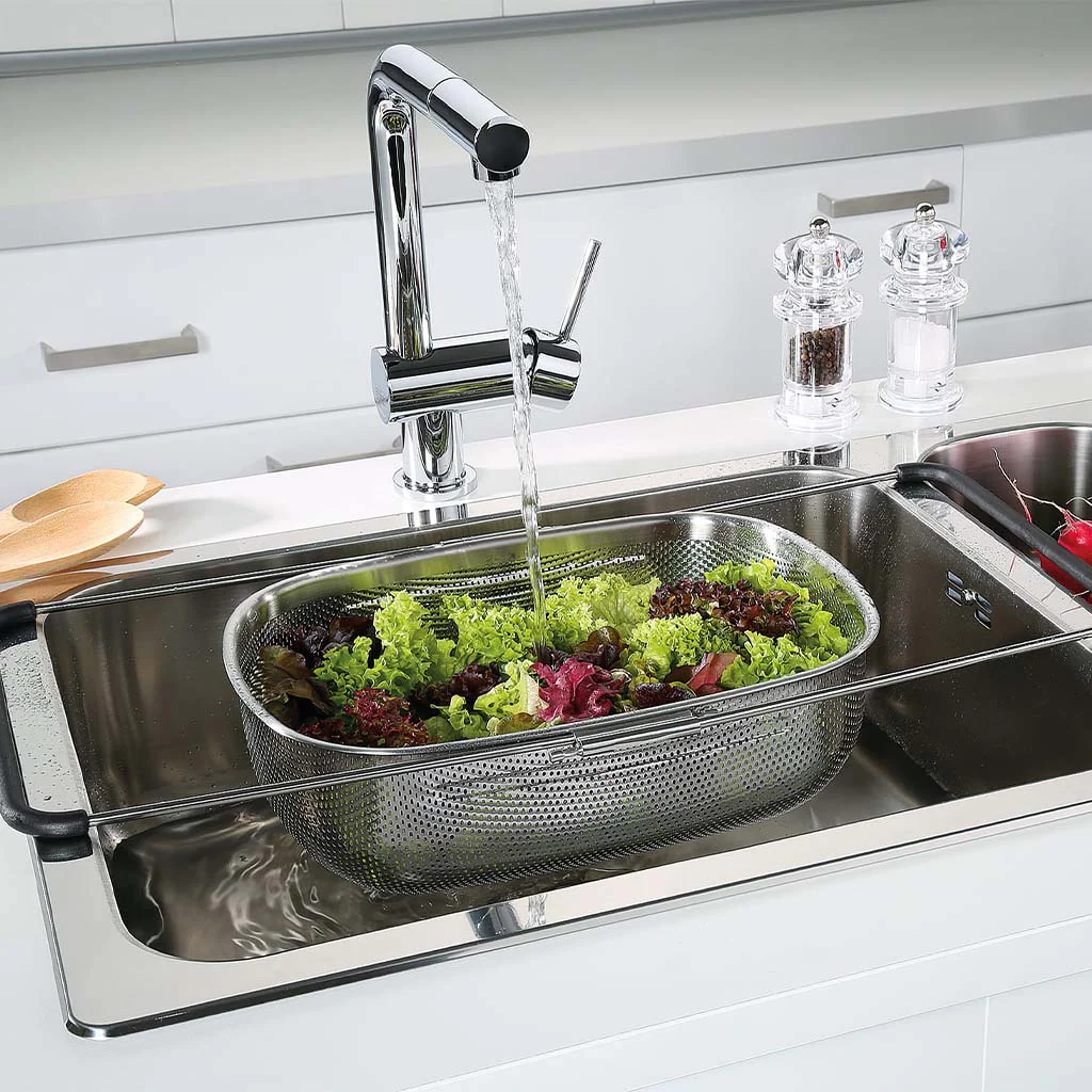 Gracias a sus asas extensibles (34 cm a 58 cm), se adapta a gran parte de los fregaderos de cualquier cocina, ya sea en horizontal o colocado verticalmente en los fregaderos más largos.
