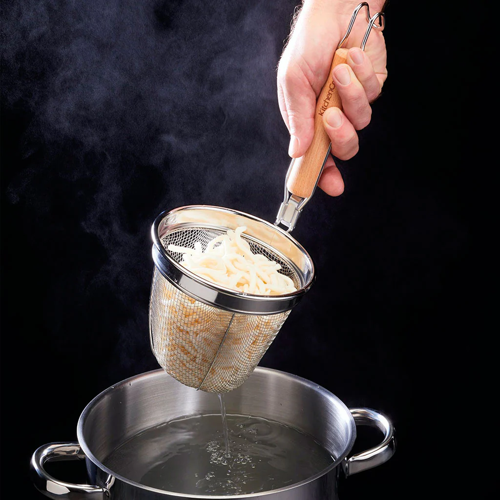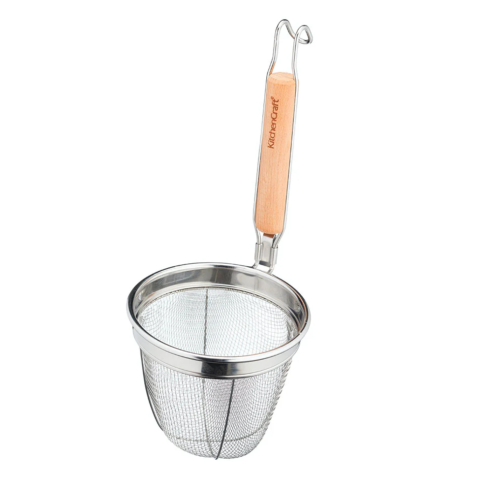 El Colador oriental para noodles de KitchenCraft es una cesta honda de malla de acero inoxidable práctica y muy versátil. Con un diseño al que no le falta detalle, cuenta con una pinza para sujetarlo a la olla durante la cocción y su largo mango de madera de eucalipto te permite su manejo cómodo y seguro, ¡incluso para usarlo como cesta para freír!