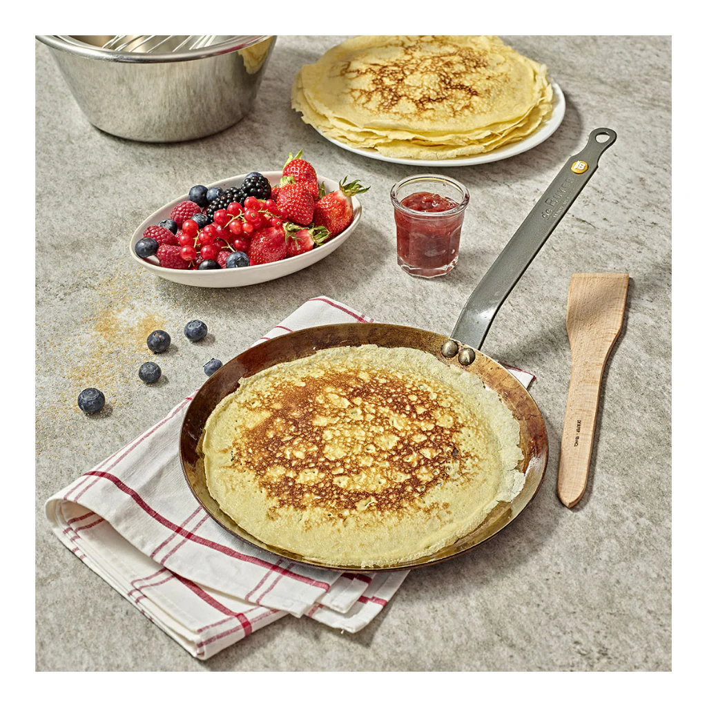 • Una crepera de hierro Mineral B De Buyer de 26 cm de diámetro, diseñada especialmente para deslizar y voltear las crepes por su superficie, gracias a sus bordes redondeados.