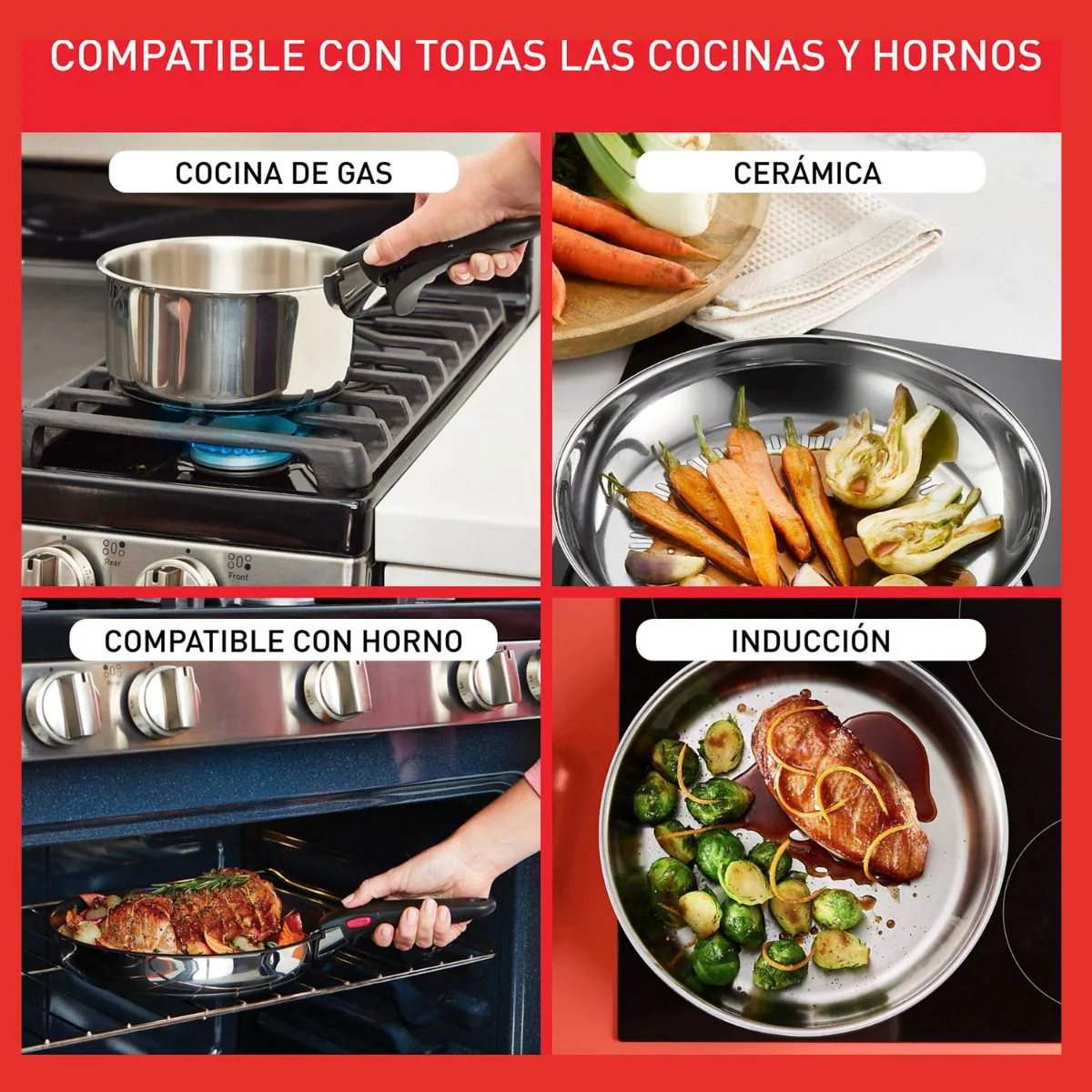 • Compatible con inducción. Totalmente compatible con todas las cocinas, incluidas las de gas, eléctricas, cerámicas y de inducción. Además, se puede meter en el horno, para una cocina más fácil día tras día.