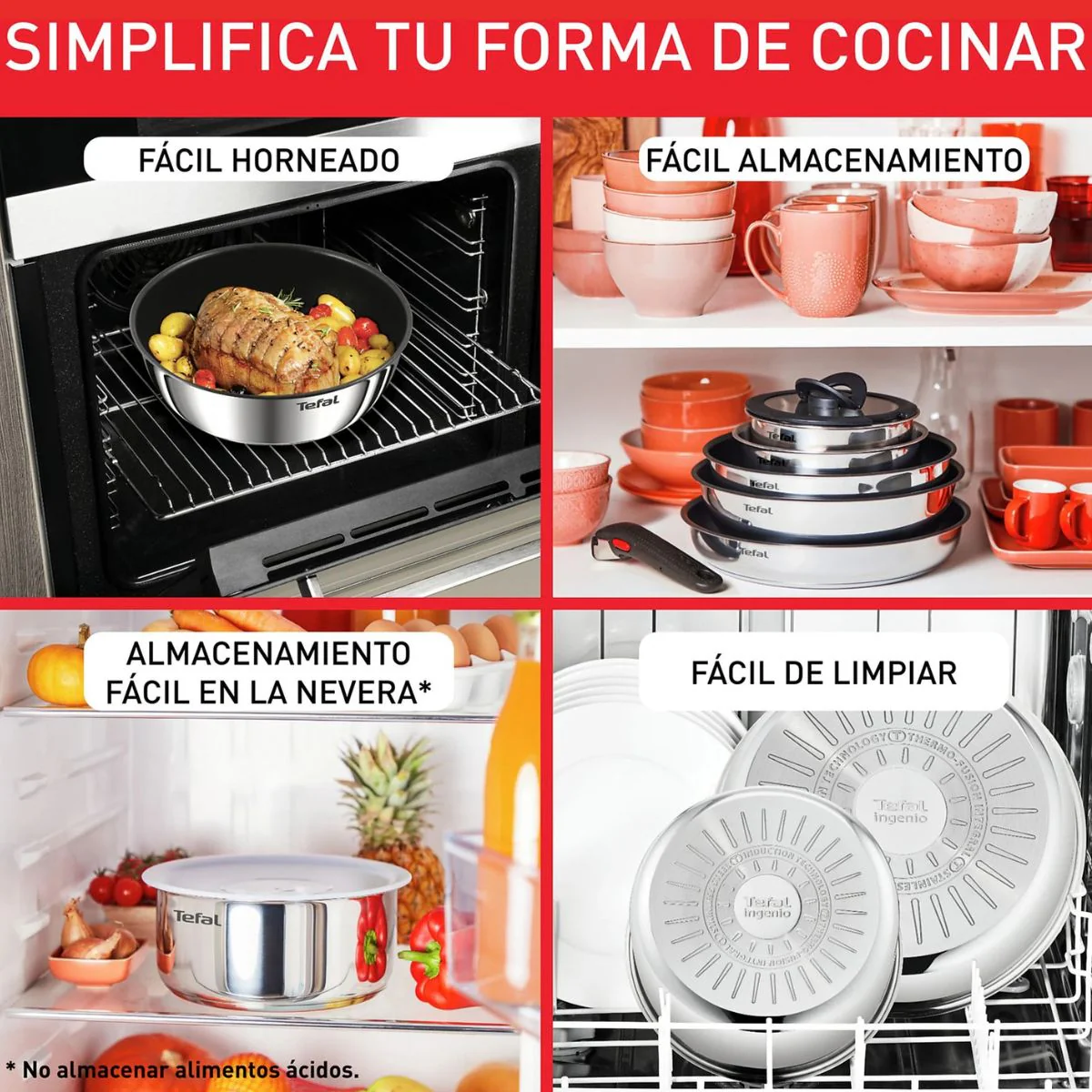 • Un menaje que lo hace todo. Deja que la cocina fluya cada día. Solo tienes que simplificar tu manera cotidiana de cocinar: un mango extraíble, una sartén apta para horno y lavavajillas y un diseño apilable que ahorra espacio. *No almacenar alimentos ácidos.