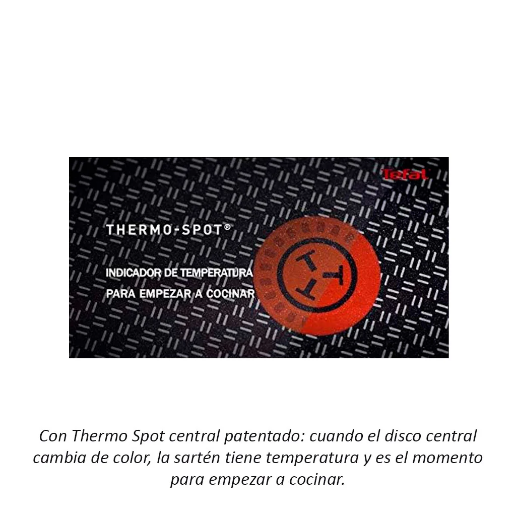 • Con indicador de temperatura Thermo-Spot en la base superior de la sartén: el sello central de la sartén cambia de color en el momento que alcanza la temperatura óptima para iniciar la cocción, ¡Y el exterior de acero inoxidable te asegura poder calentar las sartenes con la máxima versatilidad!