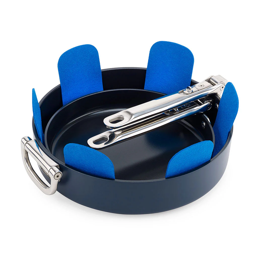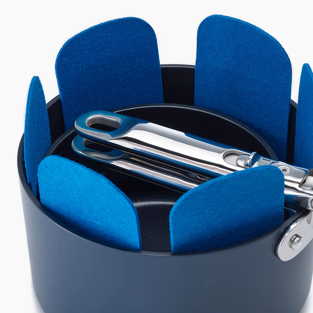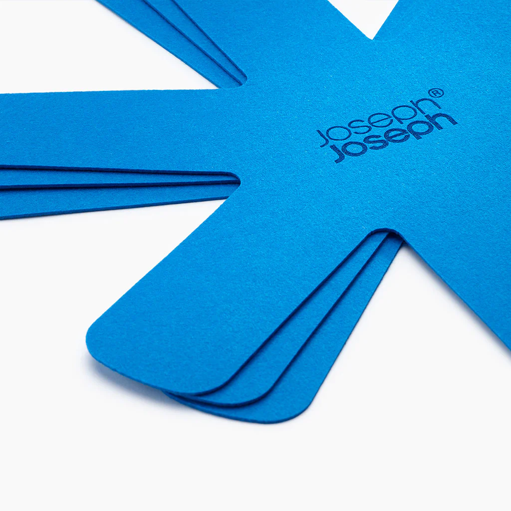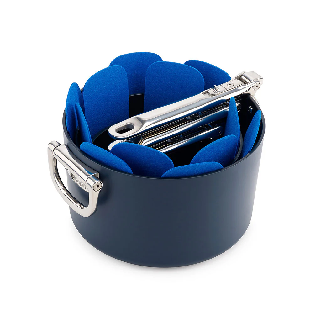 Si quieres proteger de arañazos tus sartenes, ollas, cazuelas o cazos, con el Conjunto de 3 protectores para sartenes Space Joseph Joseph, lo tendrás muy fácil. Este set incluye tres piezas de fieltro de color azul, diseñadas especialmente para actuar como una suave capa protectora para tus utensilios. No tendrás que preocuparte al almacenarlos uno dentro de otro.