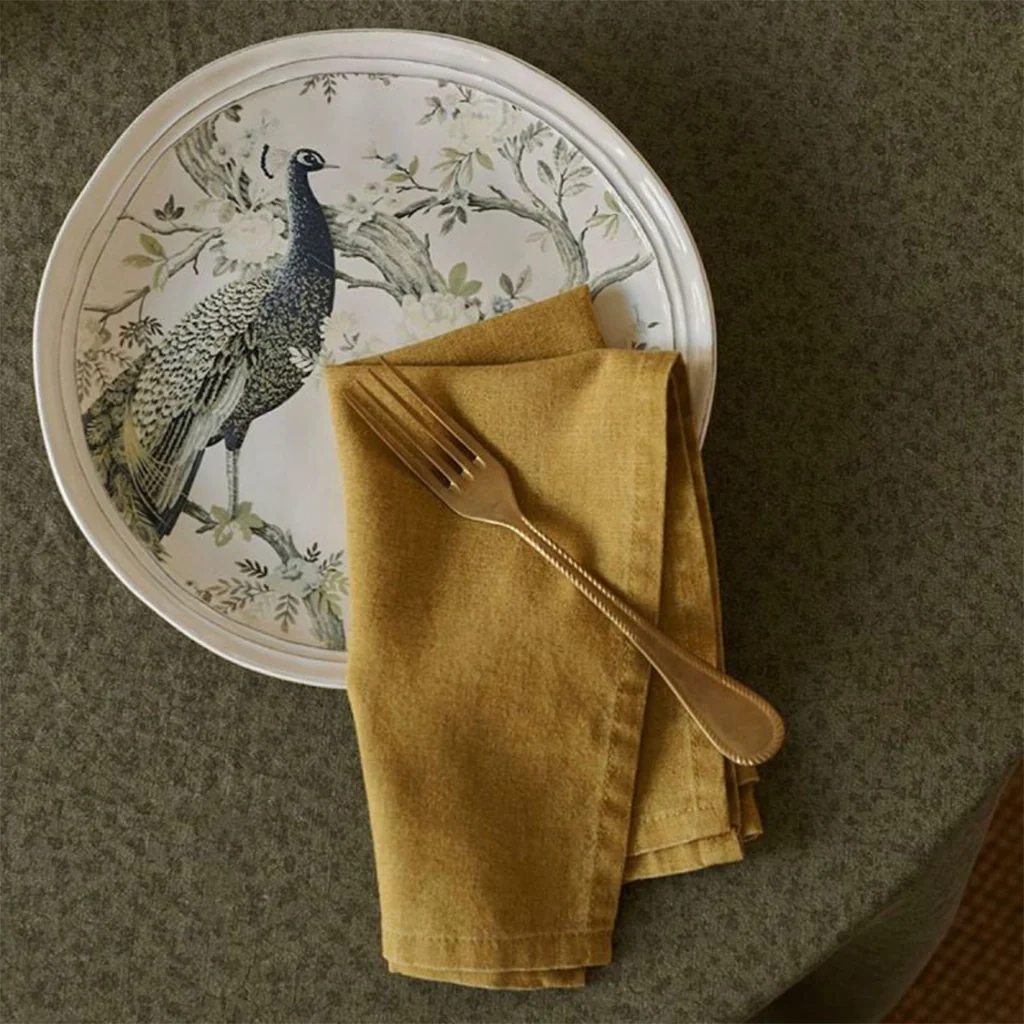 - Conjunto 20 cm. Formado por 4 platos de 20 cm de diámetro, de base blanca y líneas grises, con estampados del pavo real en colores suaves. Perfectos como platos de postre o para presentar aperitivos, canapés, la pieza de bollería del desayuno o el pan de cada comensal.