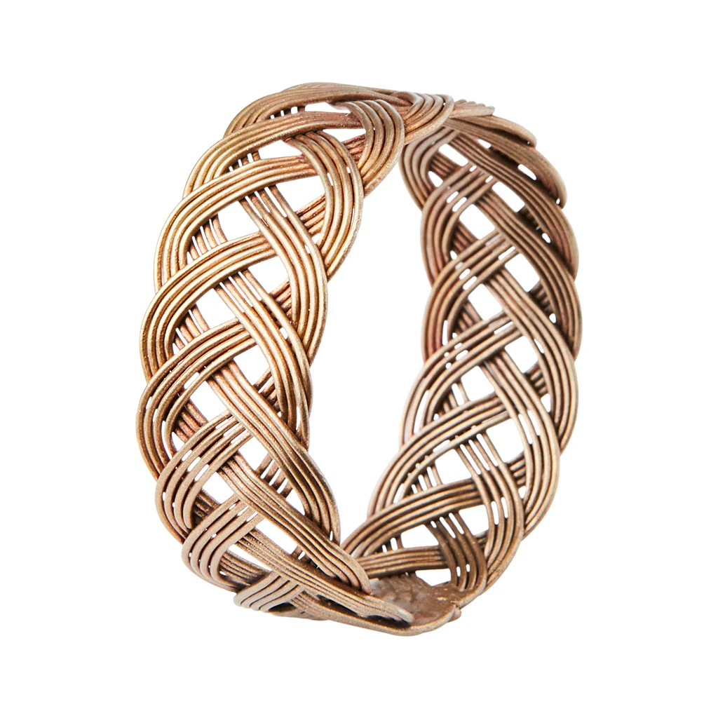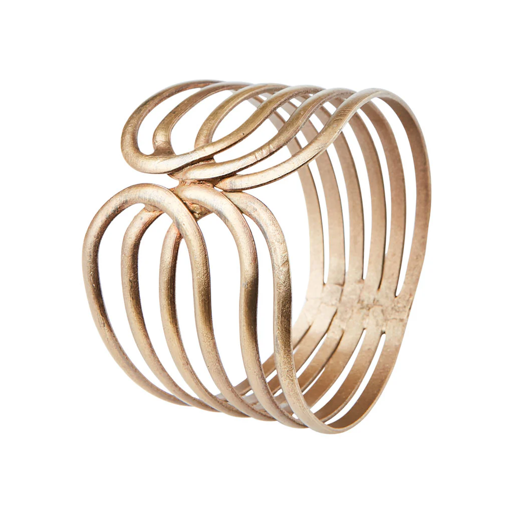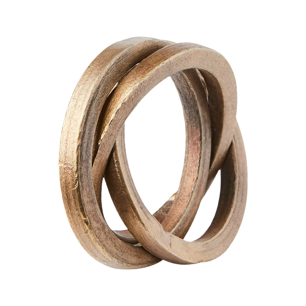 A modo de cuatro elegantes pulseras, el Conjunto de 4 servilleteros Odin de Affari of Sweden vestirá tu mesa con mucho estilo y belleza. Los cuatro aros para servilletas están meticulosamente diseñados y fabricados en hierro de alta calidad, en un cautivador color latón. Cada pieza es única en su diseño para que identificar cada servilleta sea algo tan sencillo como glamuroso.