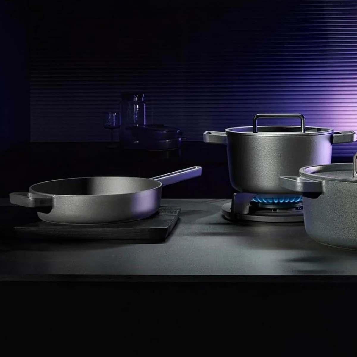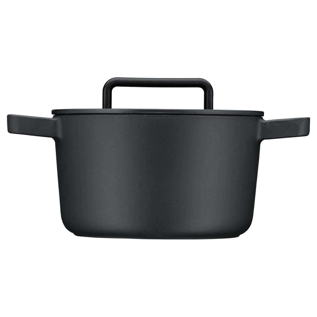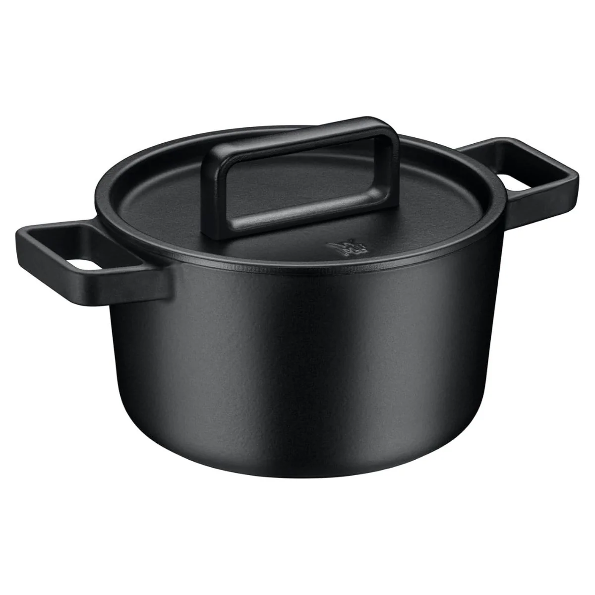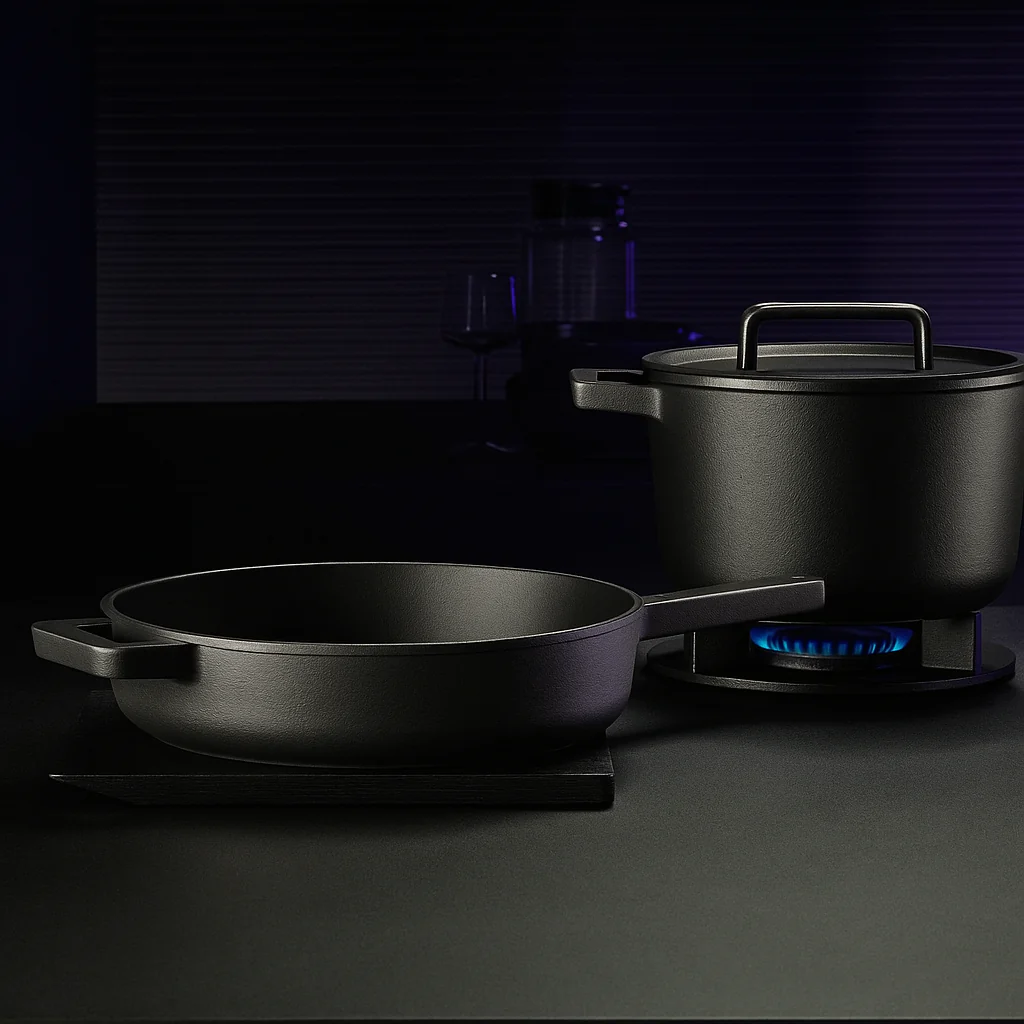 El Conjunto de cocotte y sartén de hierro fundido Flavour WMF es un set de dos piezas de hierro fundido esmaltado, a las que no les falta ni un detalle para convertirse en imprescindibles en tu cocina. Su moderno diseño minimalista, su esmaltado negro mate, su robusta construcción, su fabricación artesanal, a mano y en Alemania, y su excelente retención y transmisión de la temperatura, no solo te aseguran un auténtico disfrute al cocinar, sino que son garantía de una gran eficiencia y de excelentes resultados.