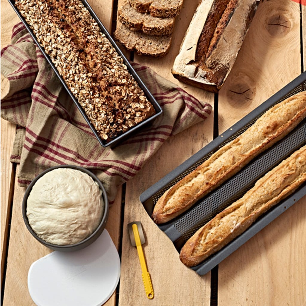 Resulta un set de lo más completo, porque los moldes que incluye te permitirán hacer panes largos tipo baguettes en el molde largo, y también todo tipo de panes tipo pan de molde o hogazas rectangulares (¡Y podrás uasr el molde rectangular también para bizcochos y plum cakes!). Los complementos, la cuchilla y la rasqueta, te ayudarán en elaboración del pan.