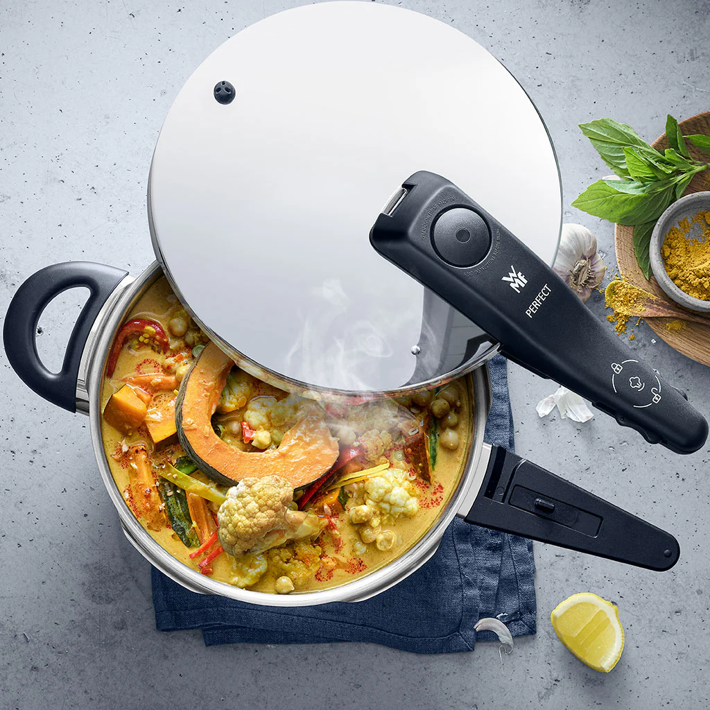 Más alemana que la bratwurst, la olla Perfect de WMF es el modelo clásico de las robustas ollas a presión de esta marca, y tiene la misma calidad y resistencia de todos los productos WMF.