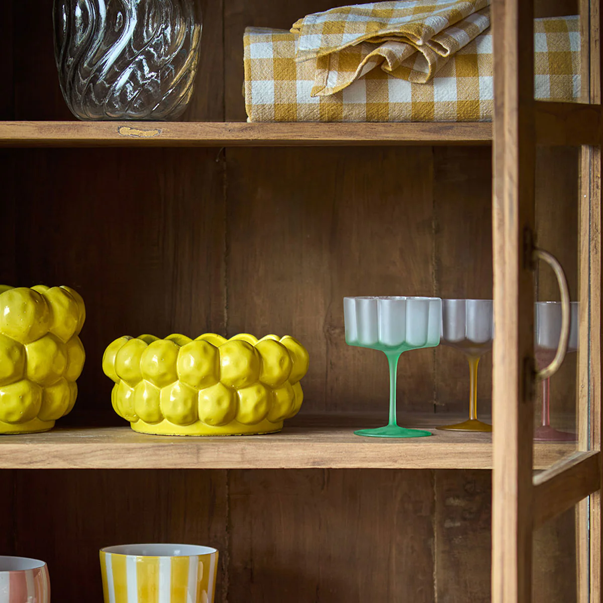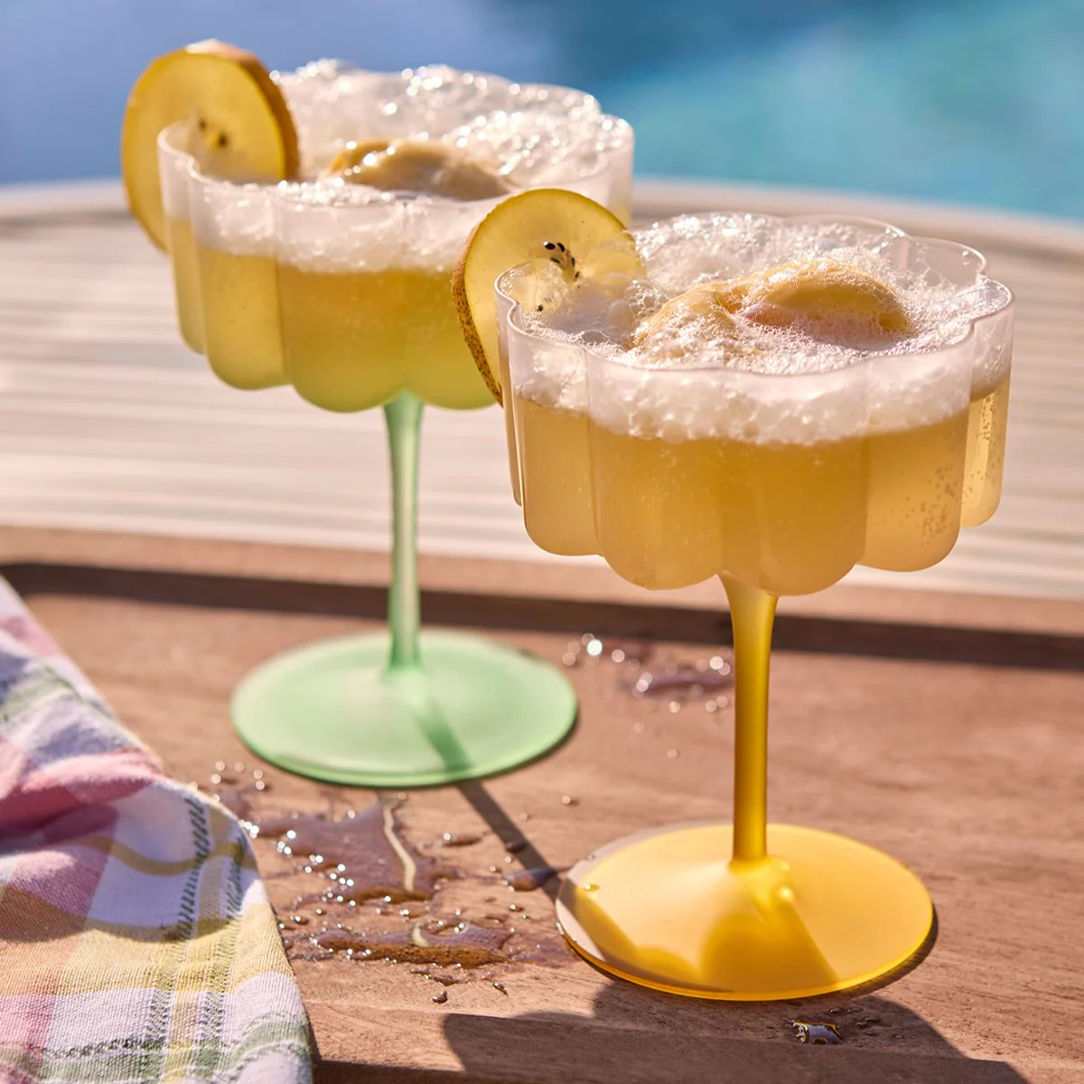Las copas tienen una capacidad de 300 ml y cuentan con un bonito diseño acanalado. Su colorido pie destaca y ofrece un bonito contraste. Y su fabricación a mano, de forma artesanal, hace que cada copa sea una pieza única e irrepetible. Desde cócteles a refrescos, a helados, cremas dulces, mousses o un cremoso arroz con leche, en esta copa podrás también presentar tus mejores entrantes de forma individual, ya sea una ensaladilla rusa o un cóctel de gambas.
