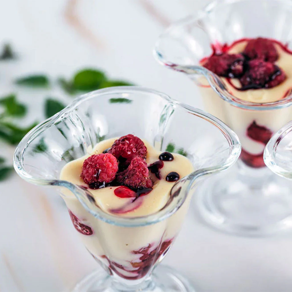 Cremas y pudines: Utiliza las copas para servir cremas y pudines, como crema catalana o pudín de chocolate, con un toque de crema batida y ralladura de chocolate.