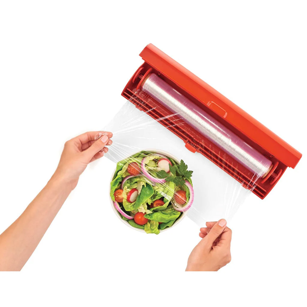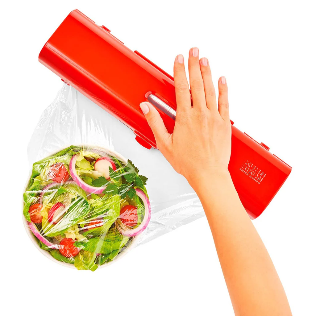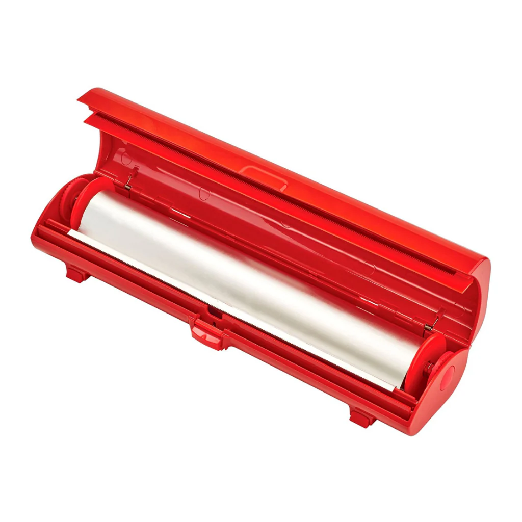 Si cortar papel film se convierte en una misión imposible, el Cortador con guillotina de Kuh Rikon te ayudará a hacerlo fácilmente y con precisión. Apta tanto para el papel plástico como el de aluminio o el de horno, esta guillotina de mesa, además de cortar con su afilada cuchilla dentada, te permite guardar un rollo en su interior.