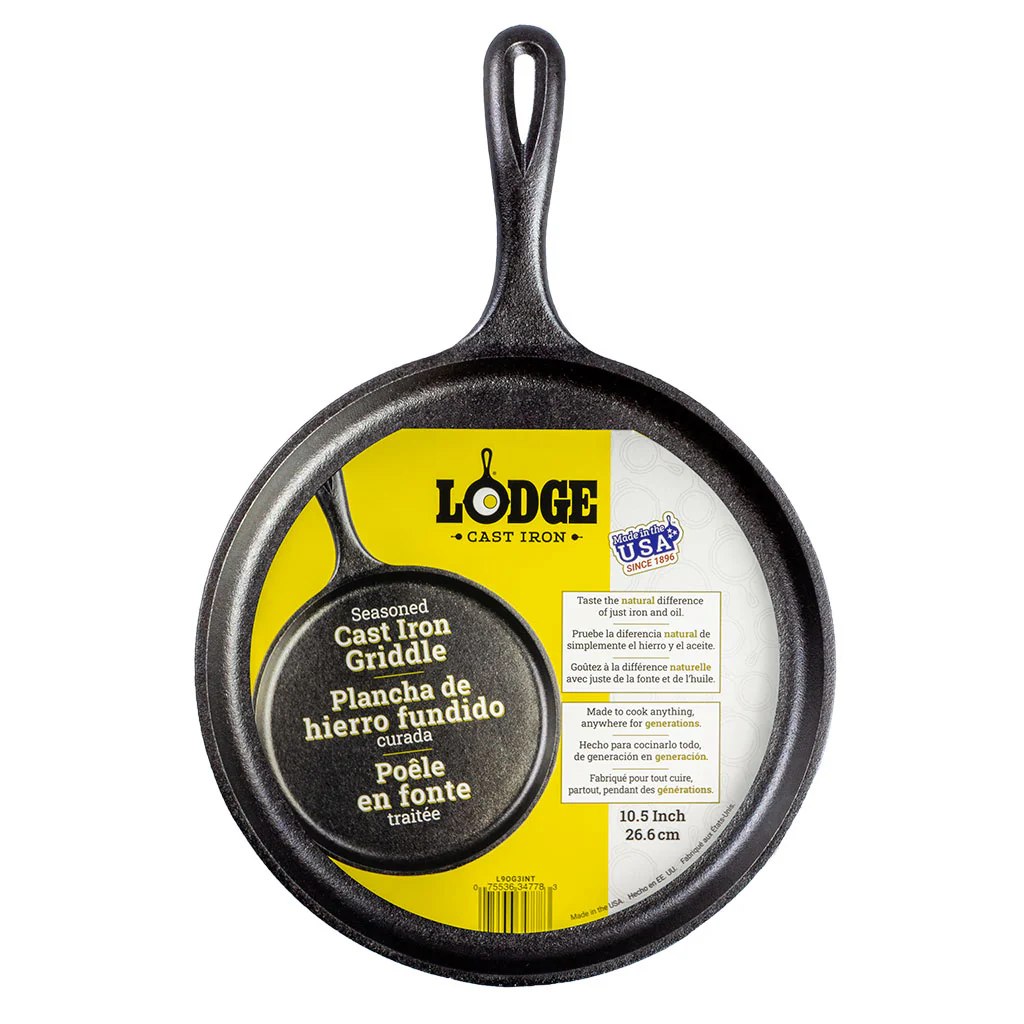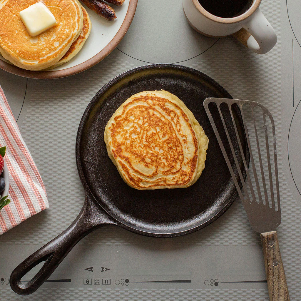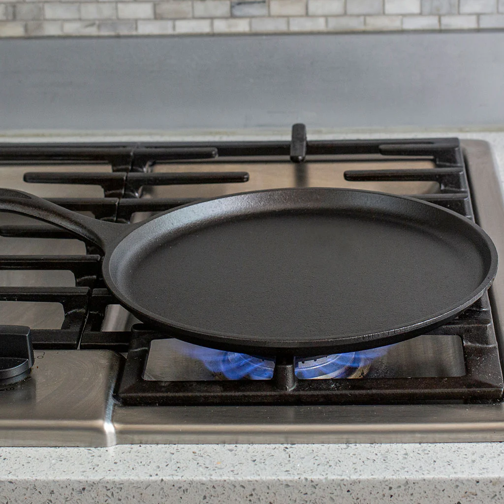 Crepes, tortitas, tortillas, incluso verduras o carnes a la plancha, con la versátil Crepera de hierro Lodge podrás preparar lo que prefieras, con unos resultados estupendos. Esta crepera de hierro fundido, con sus 26,6 cm de diámetro, es una plancha maravillosa para cocinar sin límites, gracias a su excelente retención de la temperatura y al reparto homogéneo del calor en toda su superficie. Robusta y duradera, es también de lo más eficiente.