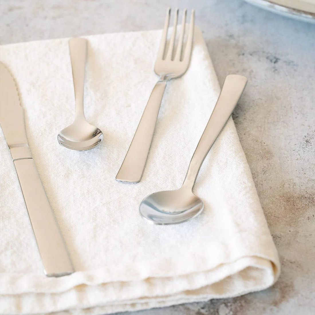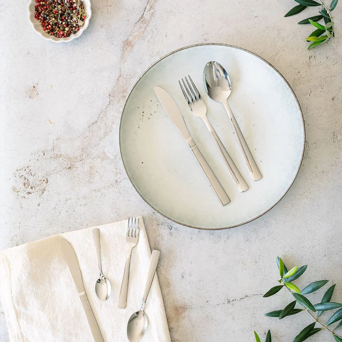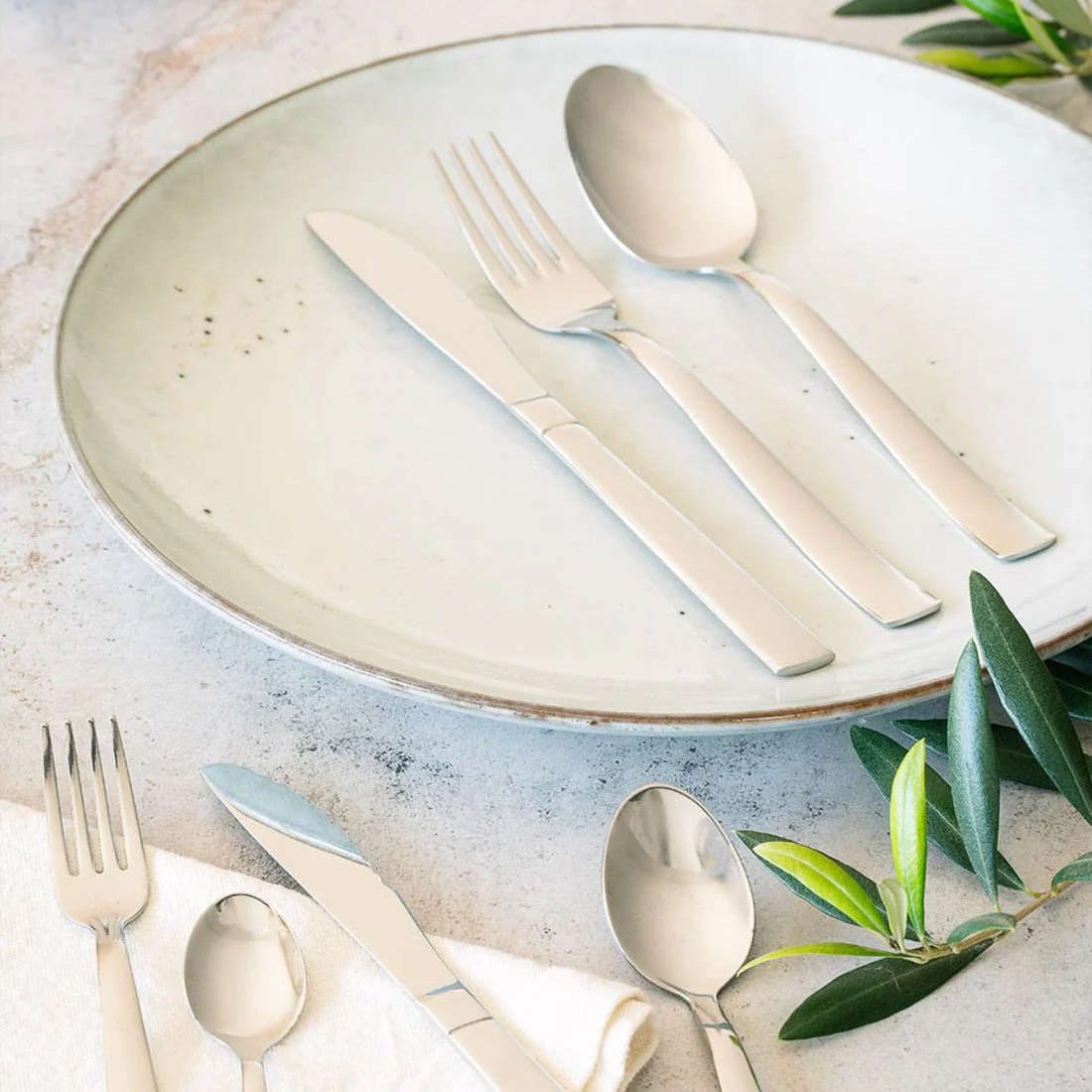 La cubertería Roma, fabricada en acero inoxidable 18/0 (sin níquel), se distingue por su diseño moderno que captura la esencia de la simplicidad y la sofisticación. Con un espesor de 2 mm, estas piezas son robustas pero elegantes, ideales para darle a tu mesa un toque vanguardista.