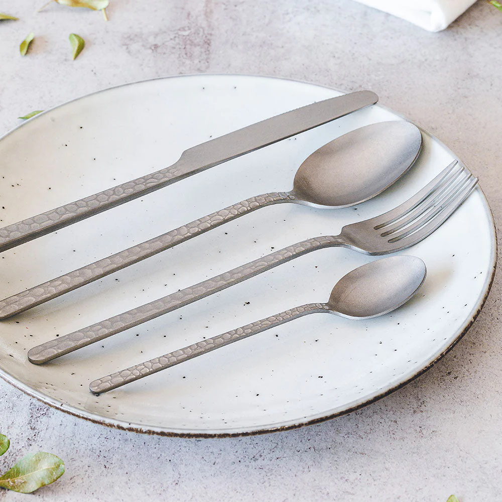 La colección de cubiertos Portofino Stone Washed está integrada por 10 piezas diferentes que cubren cualquier necesidad que puedas tener en tu mesa. Estos cubiertos están disponibles de forma individual para que puedas reponer aquellas piezas de tu cubertería Portofino Stone Washed que necesitas o bien puedas confeccionarte una cubertería a medida según tus preferencias o necesidades.