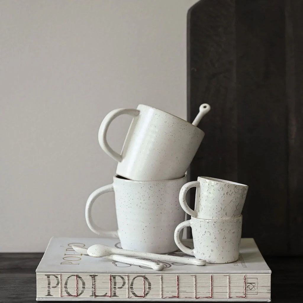Con su suave esmalte blanco grisáceo y el relieve de sus pequeñas motas, la cuchara Pion tiene un diseño informal y elegante que se adapta a cualquier estilo y ocasión. Puedes combinarla con tus tazones y mugs de cerámica en tonos similares para crear una presentación armoniosa y de lo más bonita.