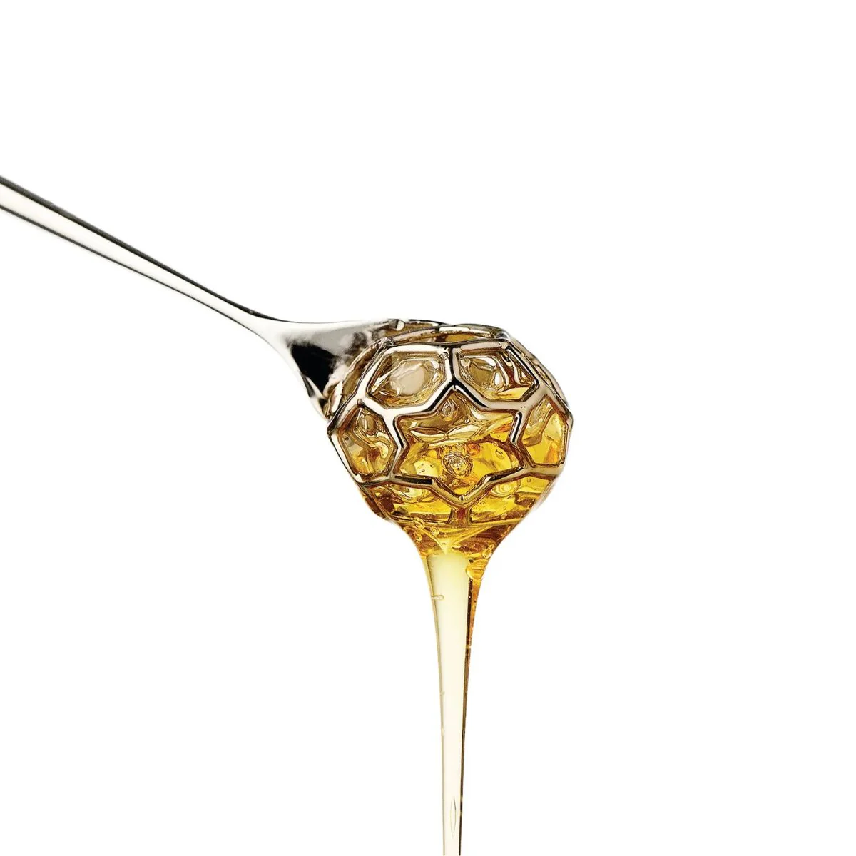 Aparte de ser una cuchara para miel de lo más práctica, a nadie se le escapa lo bonita que es. Fabricada en acero inoxidable 18/10 de la mejor calidad, esta cuchara ha sido diseñada inspirándose en las colmenas de las abejas. La cuchara está formada por un mango y una esfera con caras hexagonales que recrea una colmena en el extremo.