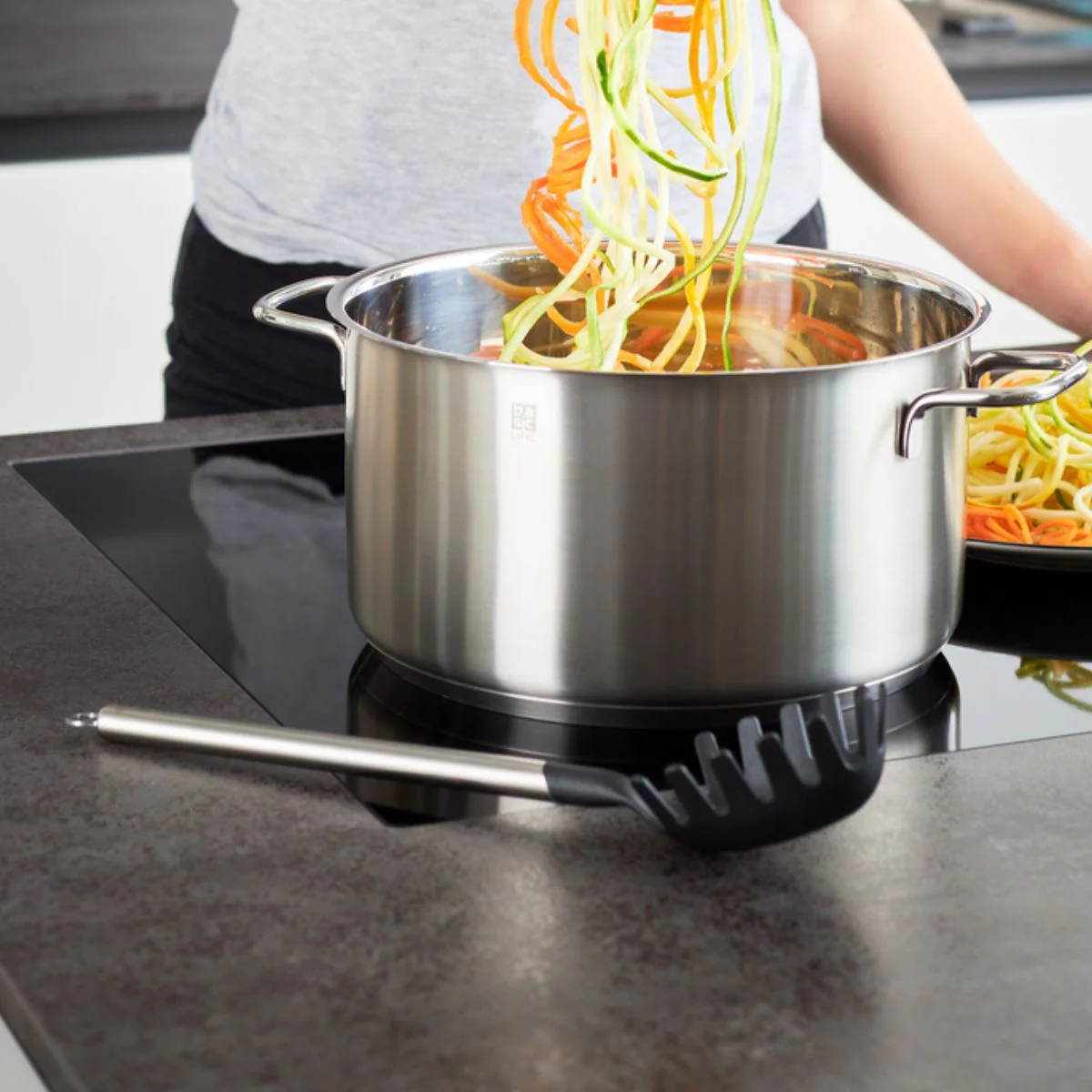 La cuchara mide 38,5 cm de largo y su cabezal dentado dispone de un orificio en el centro para escurrir el agua o el caldo de la cocción, al tiempo que las largas puntas atrapan la pasta con suavidad, especialmente la larga como tallarines o espaguetis. Podrás cocinarla en tus sartenes y cazuelas antiadherentes, y remover y servir la pasta sin miedo a dañarlas gracias a la delicadeza de las puntas del cabezal de nailon.