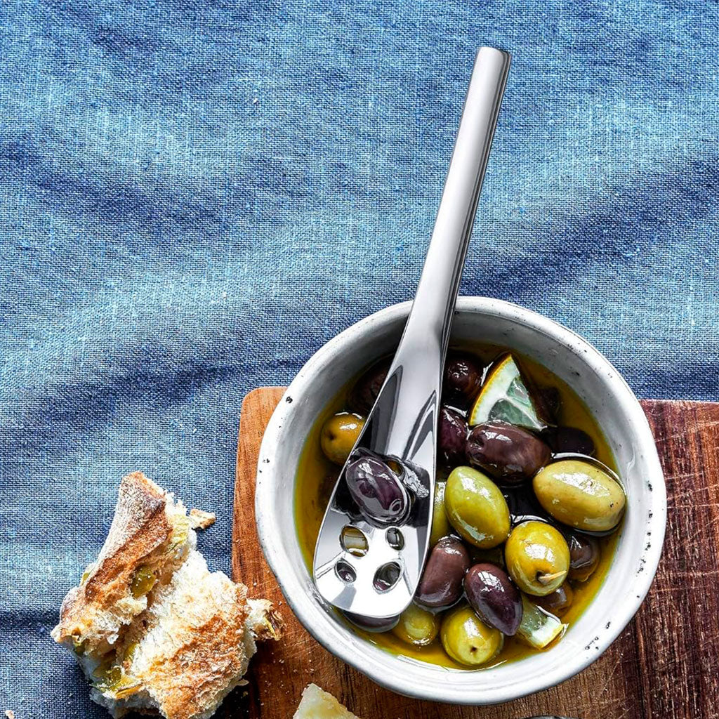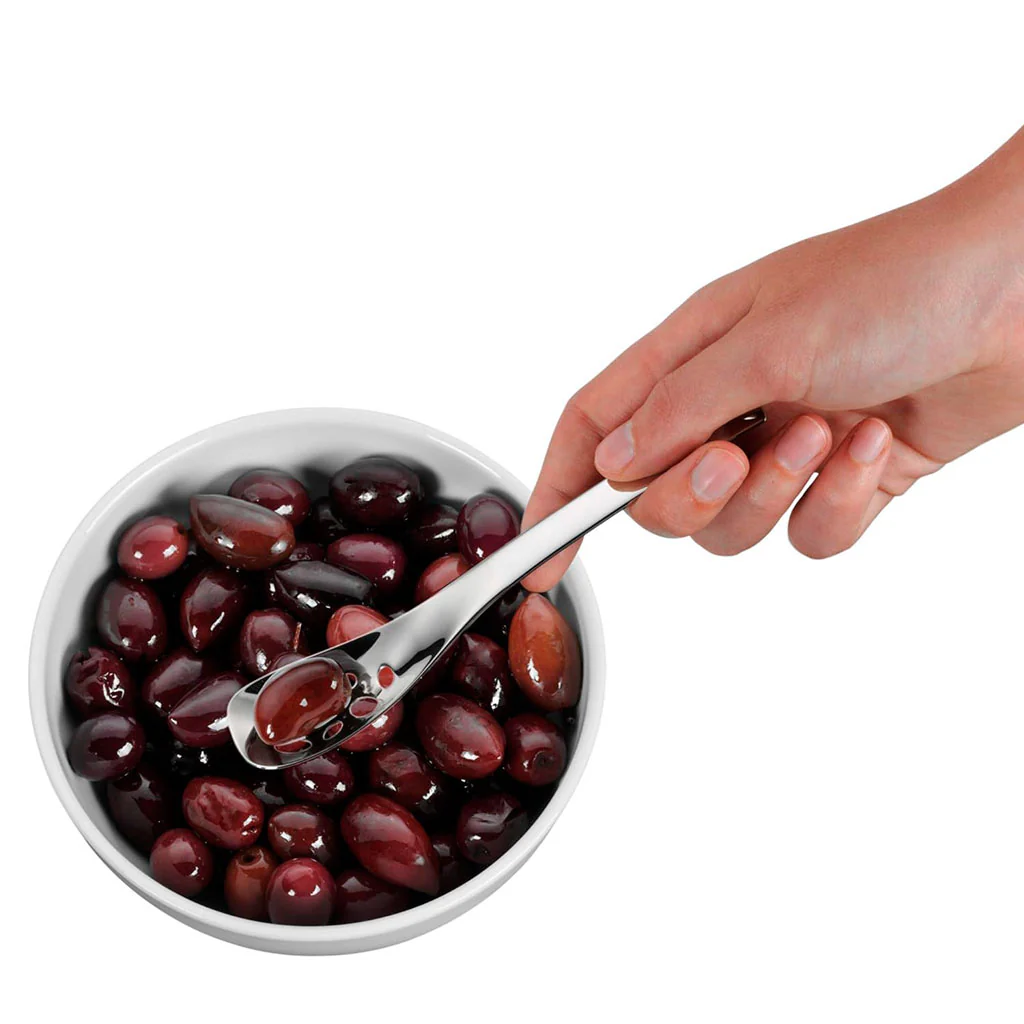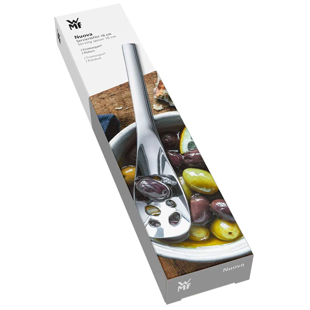La Cuchara perforada para servir Nuova WMF es una cuchara para aceitunas y mucho más. Con la cuchara perforada, podrás servir tus aperitivos cómodamente: resulta ideal para alimentos pequeños como pimientos, alcaparras, aceitunas, tomates, así como todo tipo de salsas condimentadas y otros encurtidos. ¡Los agujeros de su centro te permitirán escurrir los alimentos del bol o bote en que los tengas!