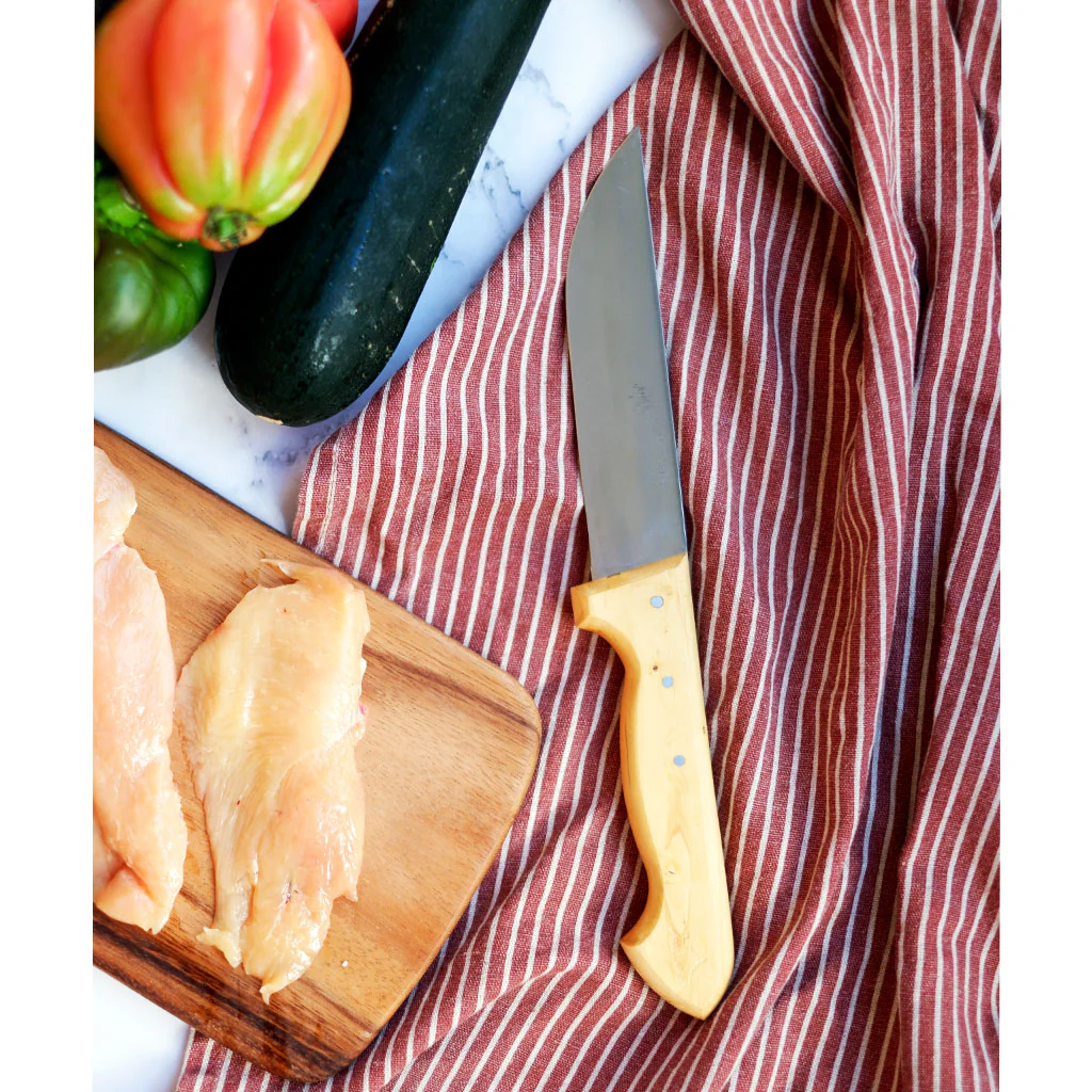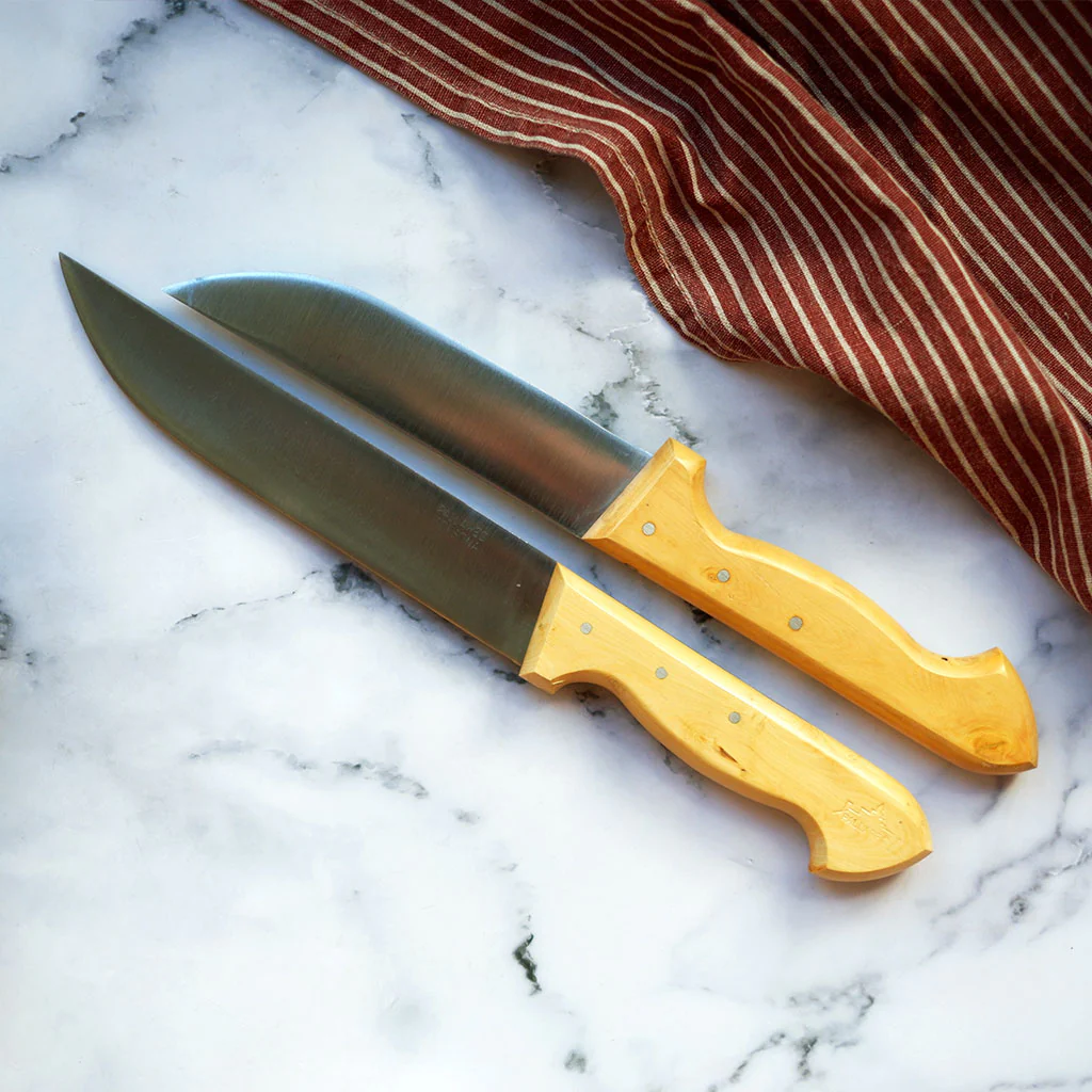 Su hoja ancha de acero al carbono hace de ellos unos cuchillos perfectos para el corte y la manipulación de la carne, así como de piezas de verduras grandes. Son unos cuchillos ideales por la resistencia y durabilidad de su hoja. Cuentan con un mango ergonómico de madera de boj que facilita su manejo y permite usarlos de forma cómoda. Su diseño elegante, con cierto aire clásico, los convertirá en imprescindibles en tu cocina.