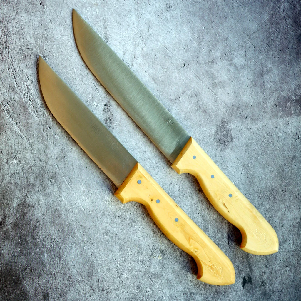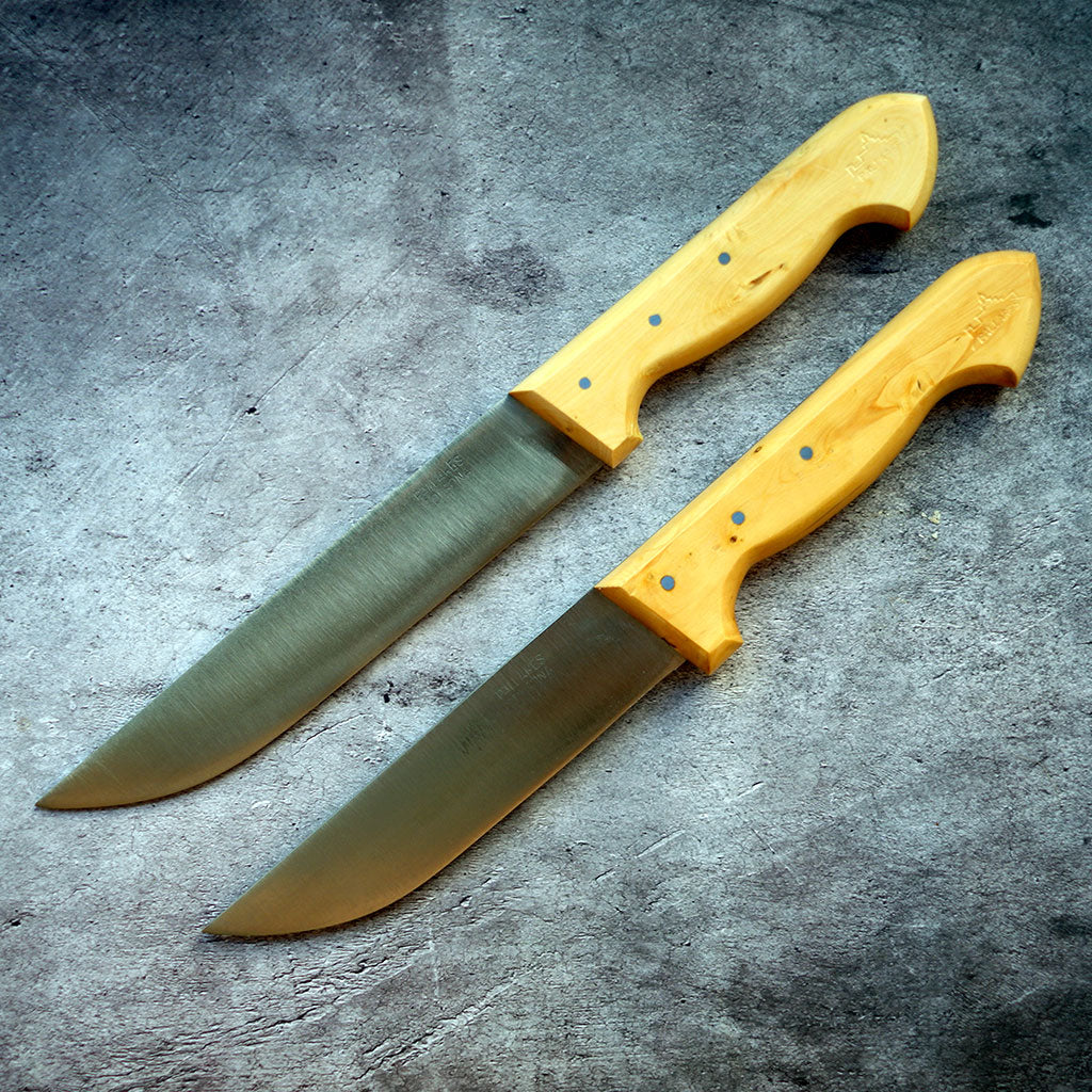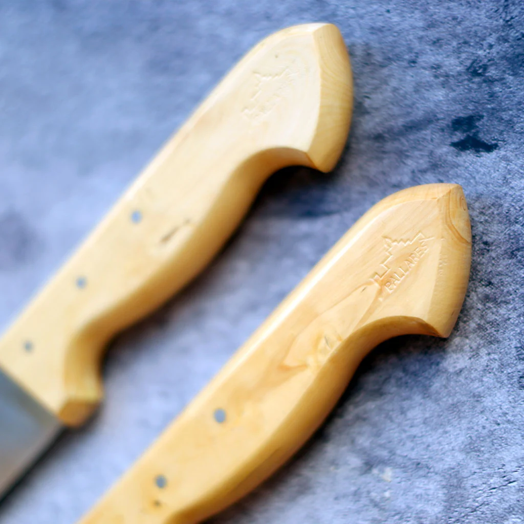 Se trata de cuchillos fabricados artesanalmente con hierro (acero carbono) y madera de boj. Su hoja de acero al carbono es más resistente y se mantiene afilada por más tiempo que la hoja de los cuchillos de acero inoxidable, pero es muy importante secarlos tras usarlos y mantenerlos en un ambiente seco. Nunca hay que lavarlos en el lavavajillas. Es recomendable extender una gota de aceite en la hoja si vas a estar un tiempo sin usarlos, para evitar que aparezcan manchas de óxido. De todas formas es normal que con el tiempo y el uso se oscurezcan un poco, ya que se va formando una pátina natural, que forma parte del encanto de estos cuchillos.