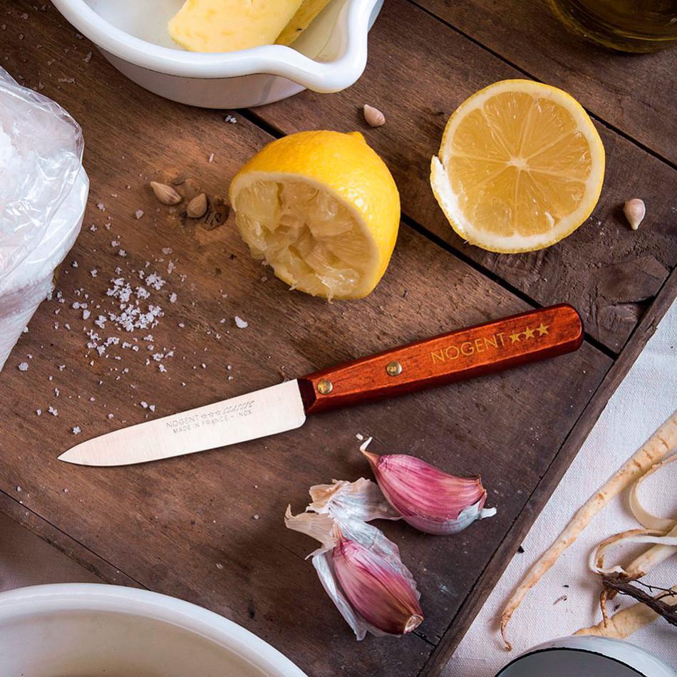 Nogent 3 estrellas es un popular cuchillo francés que podemos encontrar en casi todos los hogares de nuestro país vecino. Es un cuchillo robusto, ligero y afilado que usaremos a diario para todo tipo de cortes en la cocina: pelar, cortar frutas y verduras, patatas, queso, embutido, etc…