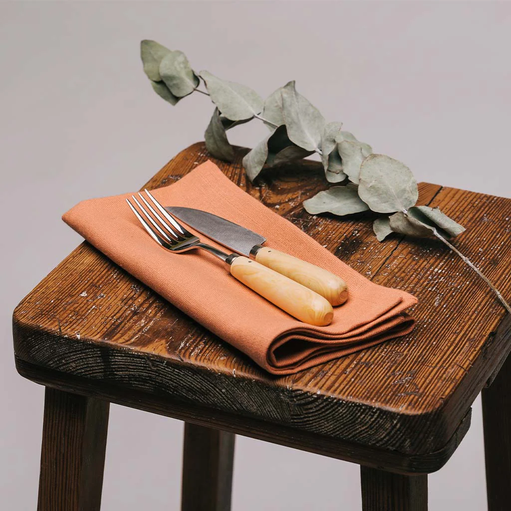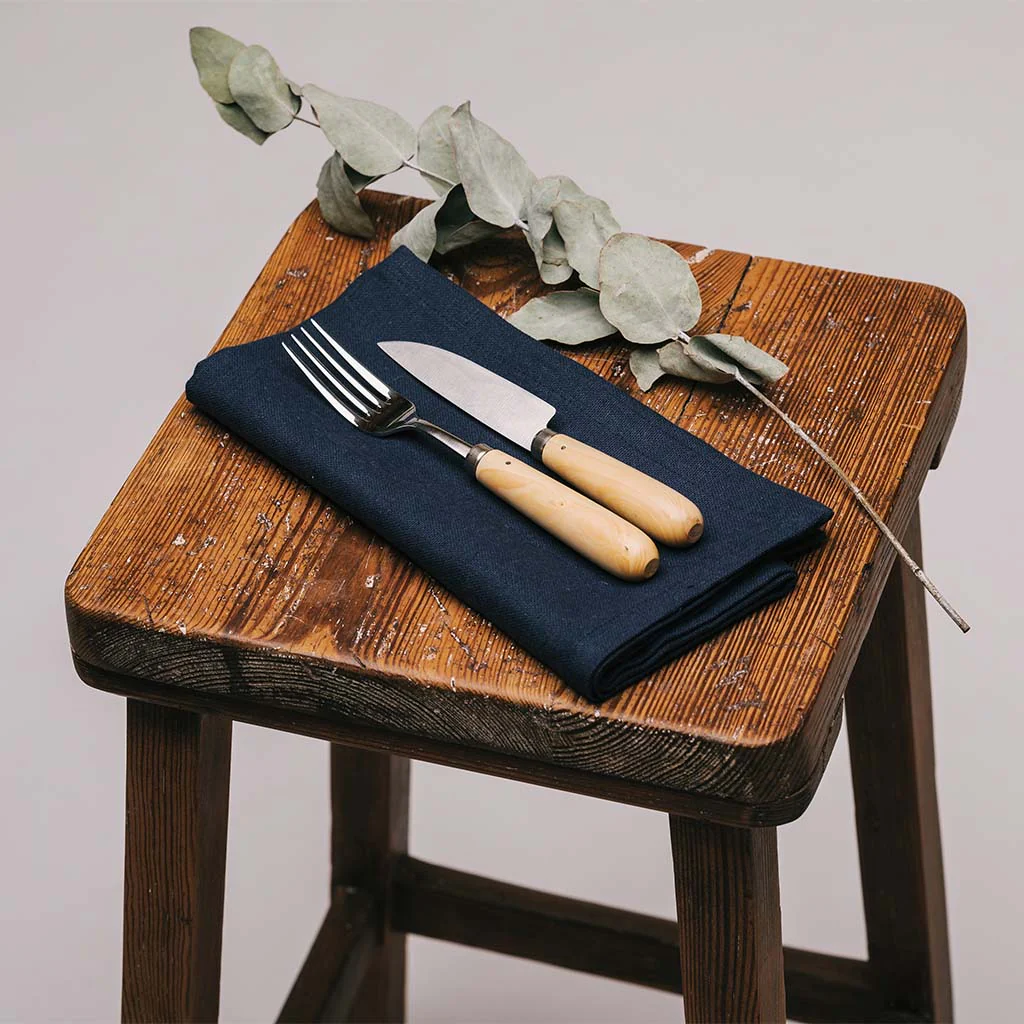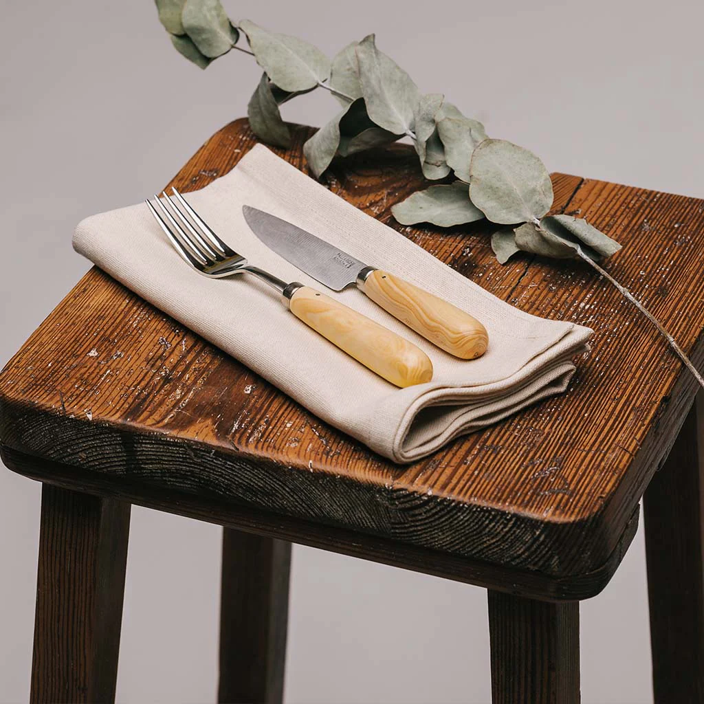Estos cuchillos se fabrican artesanalmente con hierro (acero carbono) y madera de boj. Al ser de acero carbono, son más resistentes y se mantienen afilados por más tiempo que los de acero inoxidable, pero es muy importante secarlos tras usarlos y mantenerlos en un ambiente seco. Nunca ponerlos en el lavavajillas. También podemos extender una gota de aceite en la hoja si vamos a estar un tiempo sin usarlos para evitar que aparezcan manchas de óxido. De todas formas es normal que con el tiempo y el uso se oscurezcan un poco, se va formando una patina de forma natural que forma parte del encanto de estos cuchillos.