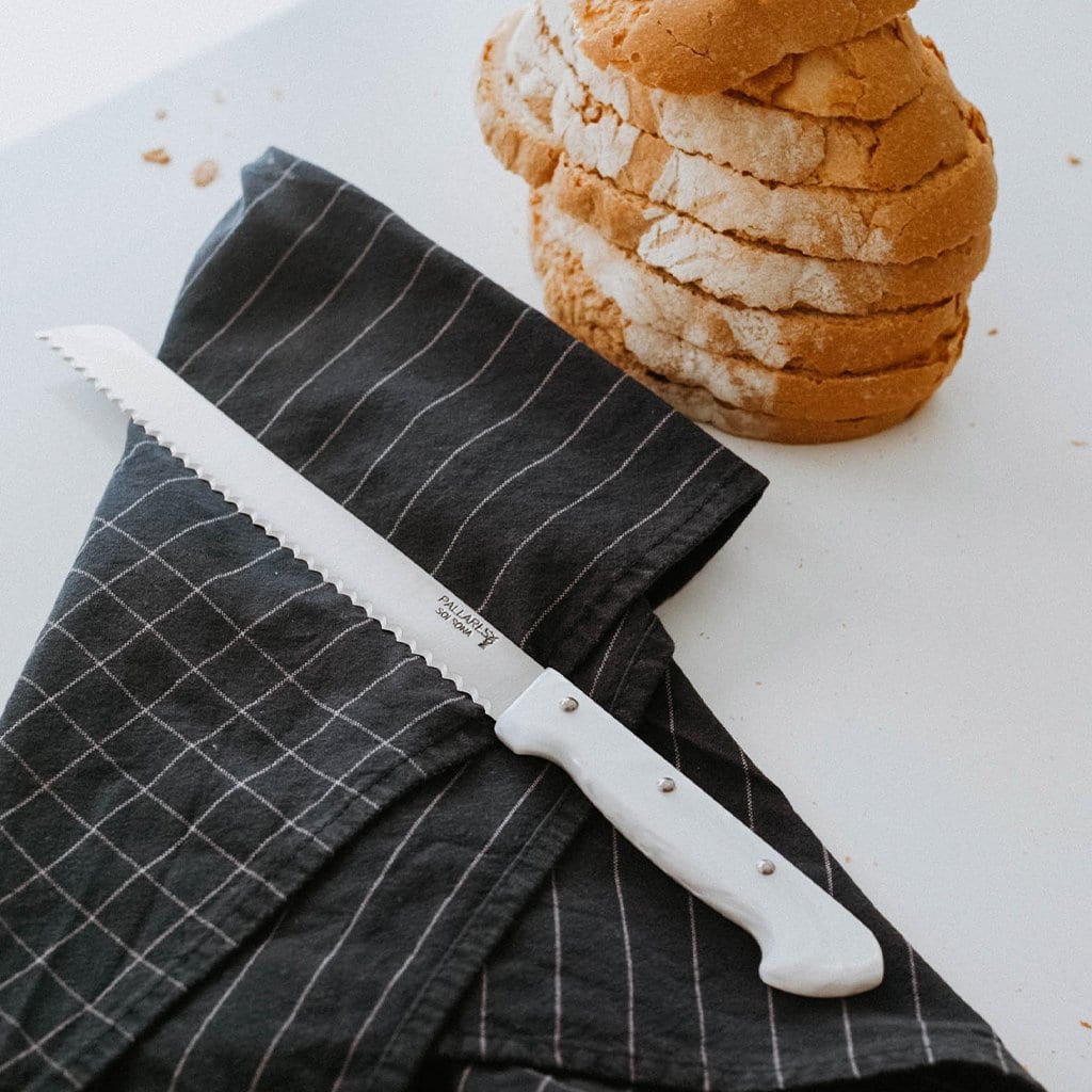 El cuchillo para pan de Pallarès está fabricado artesanalmente, con hoja de acero inoxidable y con un precioso mango de nácar. Tiene una longitud de hoja de 20cm.