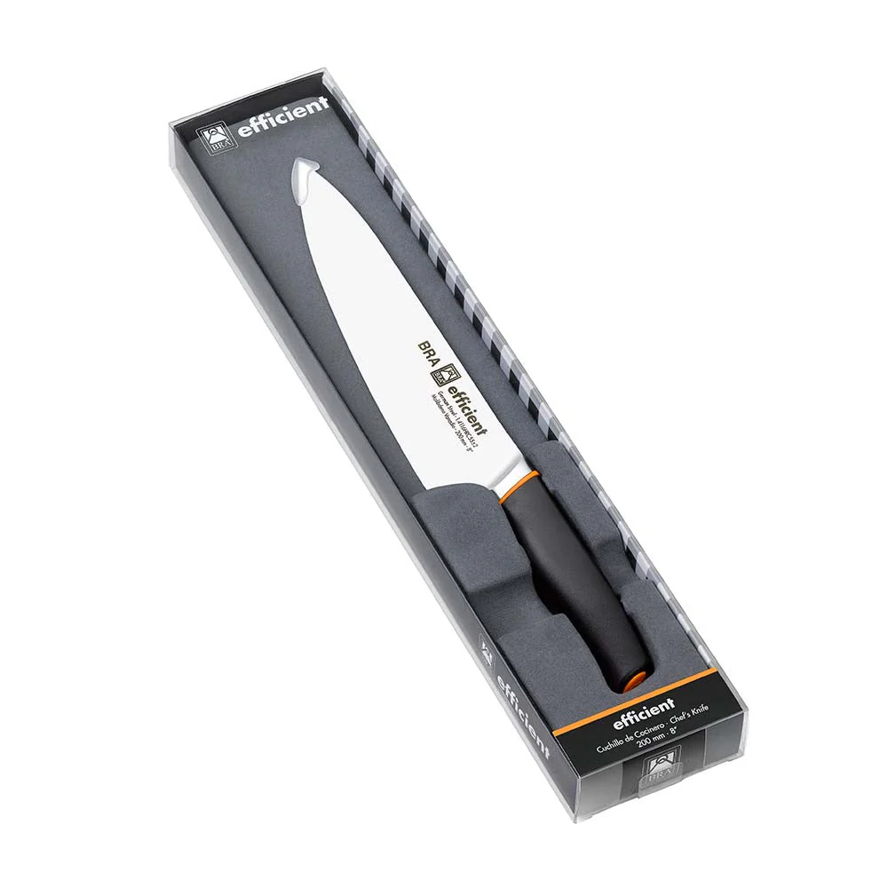 La hoja mide 250mm y recorre todo el mango del cuchillo internamente para mayor robustez. El mango está fabricado en polipropileno y su diseño es ergonómico, elegante y tiene pequeños destellos naranja, el color característico de la colección Efficient.