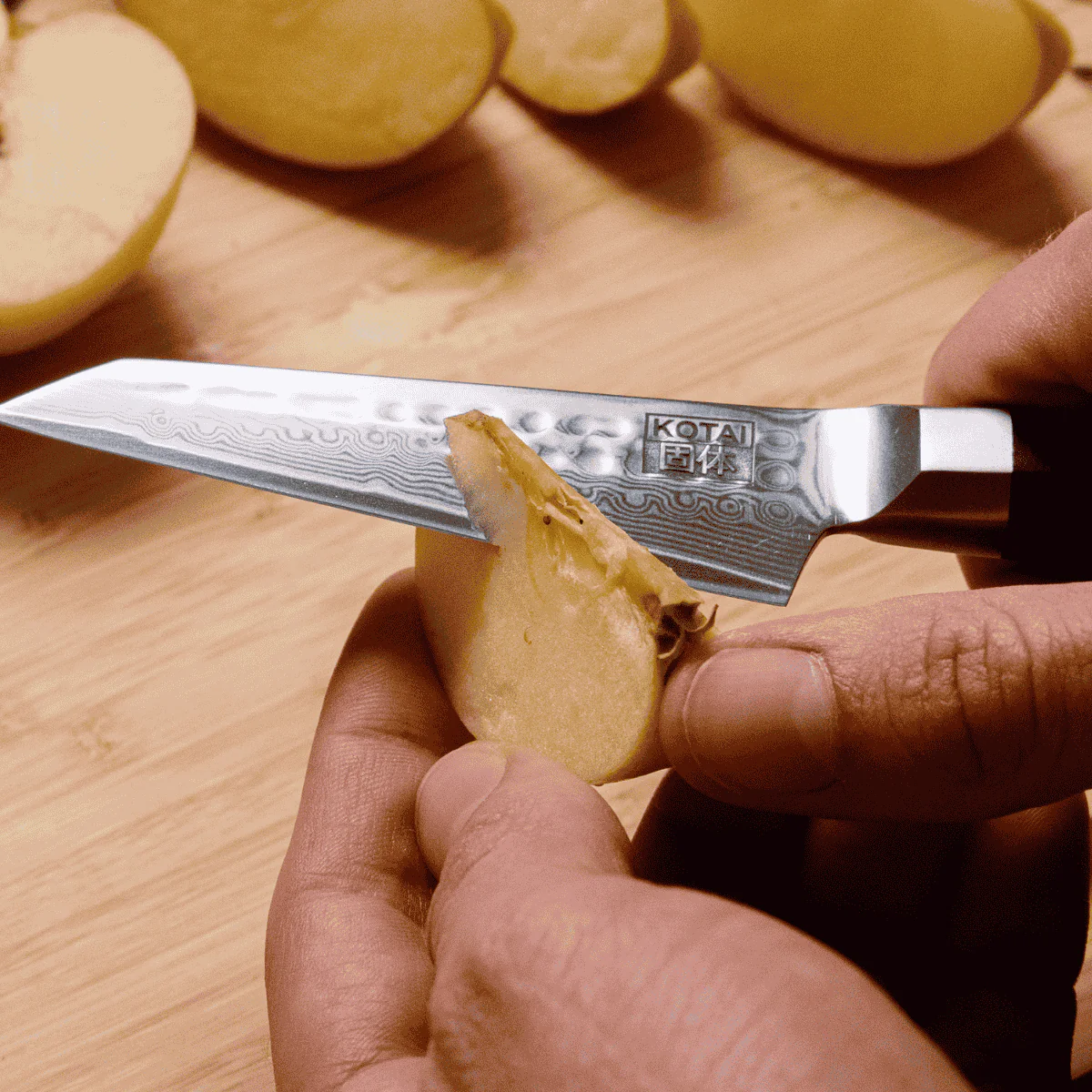 - Equilibrio en la geometría de la hoja. Las hojas de los cuchillos Kotai son un híbrido entre las hojas alemanas y las japonesas, permitiendo un corte preciso y un movimiento oscilante para picar con facilidad.