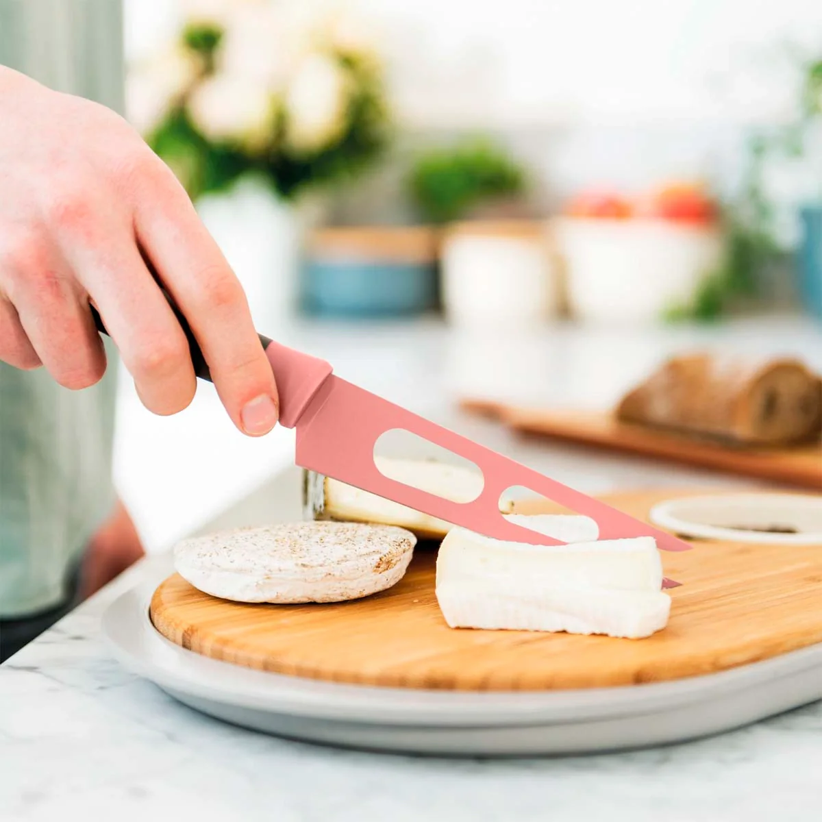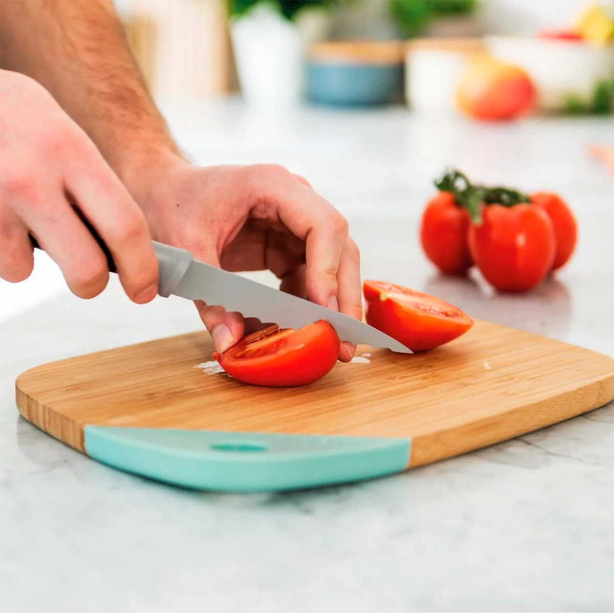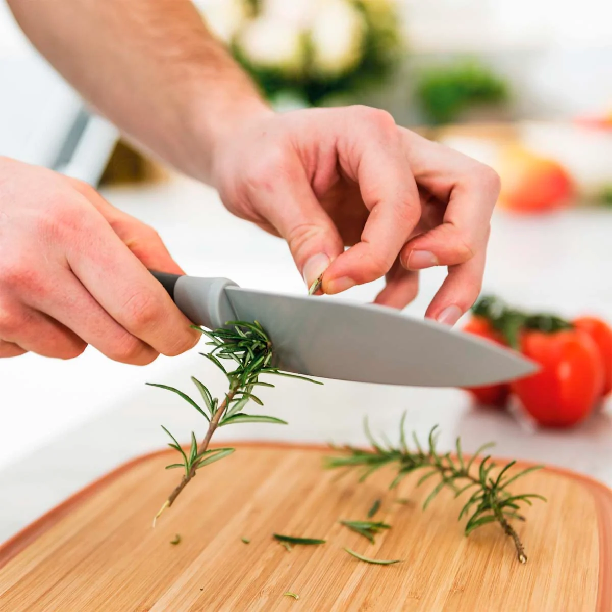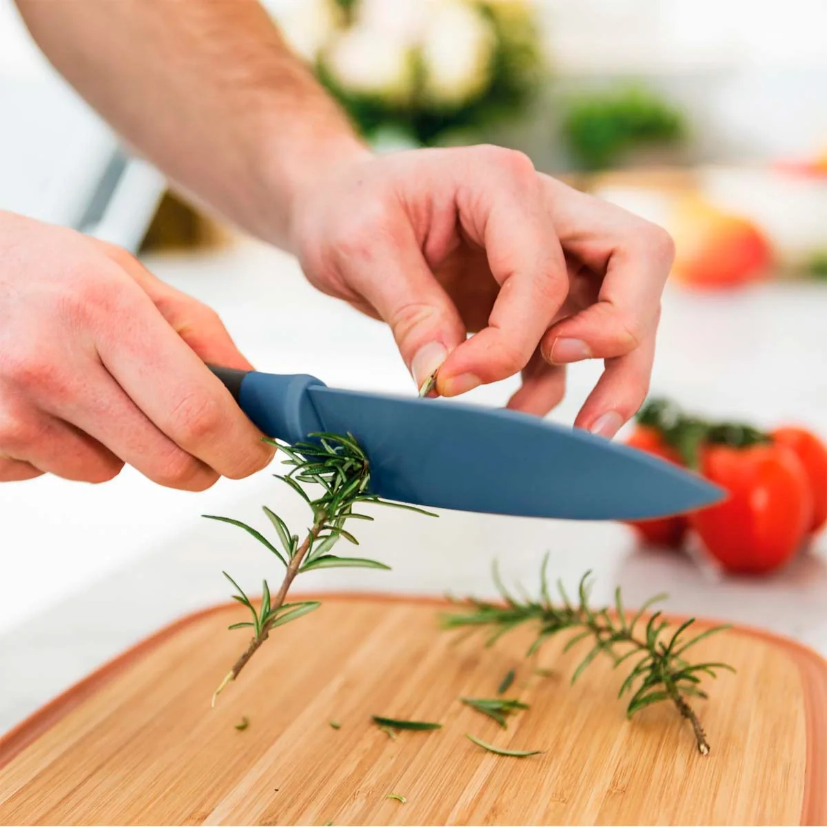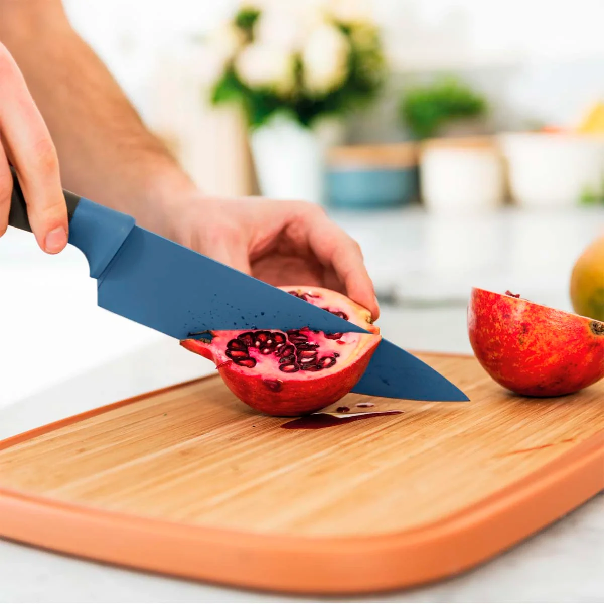 Se trata de unos cuchillos de lo más resistentes y prácticos. Sus hojas están fabricadas en acero inoxidable de gran calidad y cuentan con un revestimiento antiadherente para evitar que los alimentos se queden pegados en la hoja. Incluyen una funda para poder proteger las hojas afiladas cuando no se están utilizando y, al mismo tiempo, evitar cortes inoportunos cuando están guardados en el cajón.