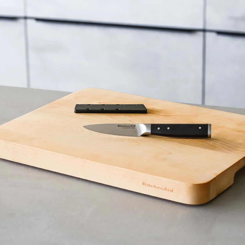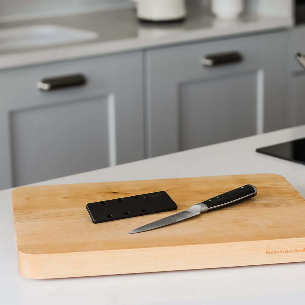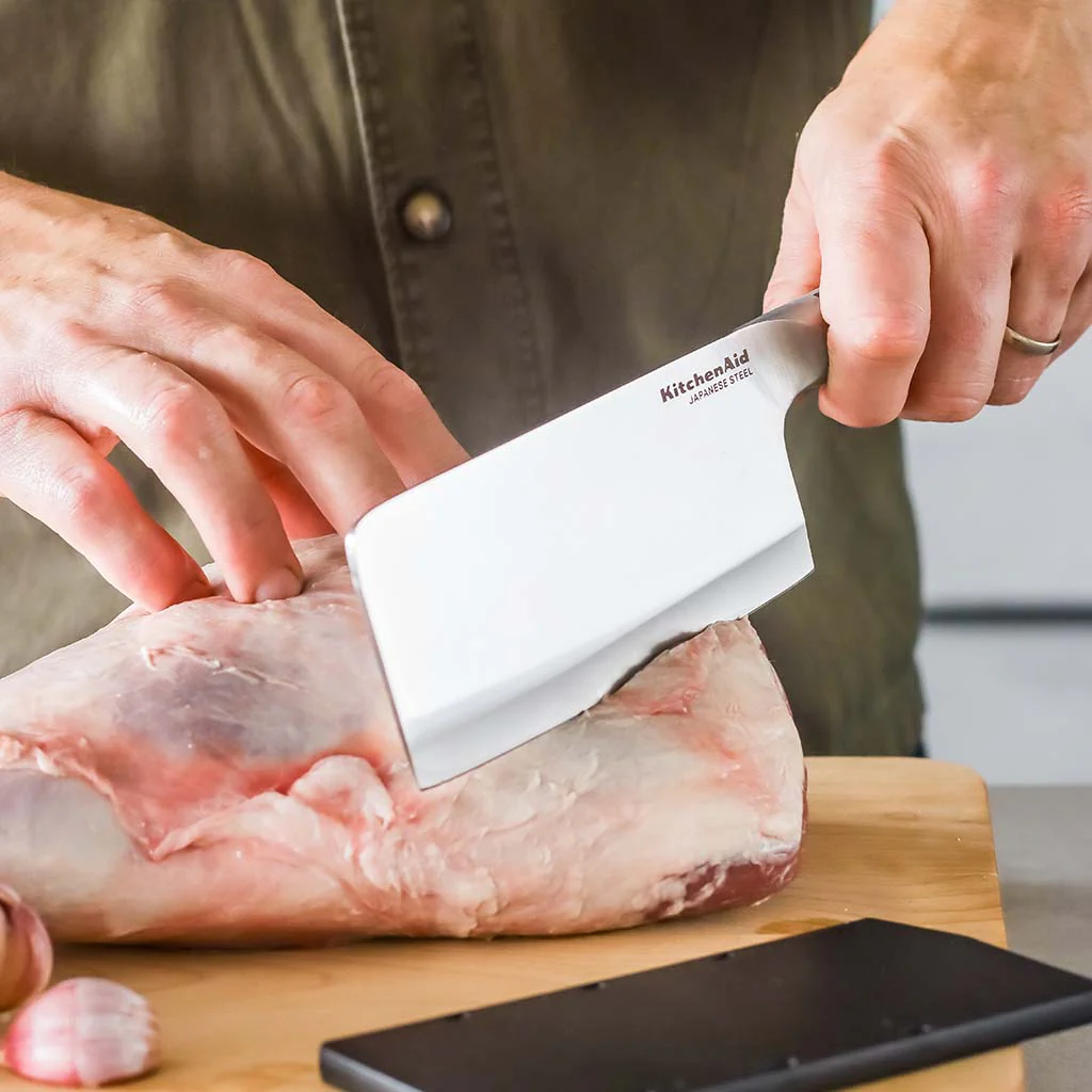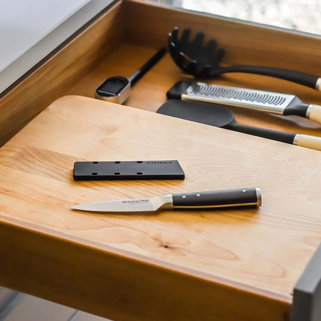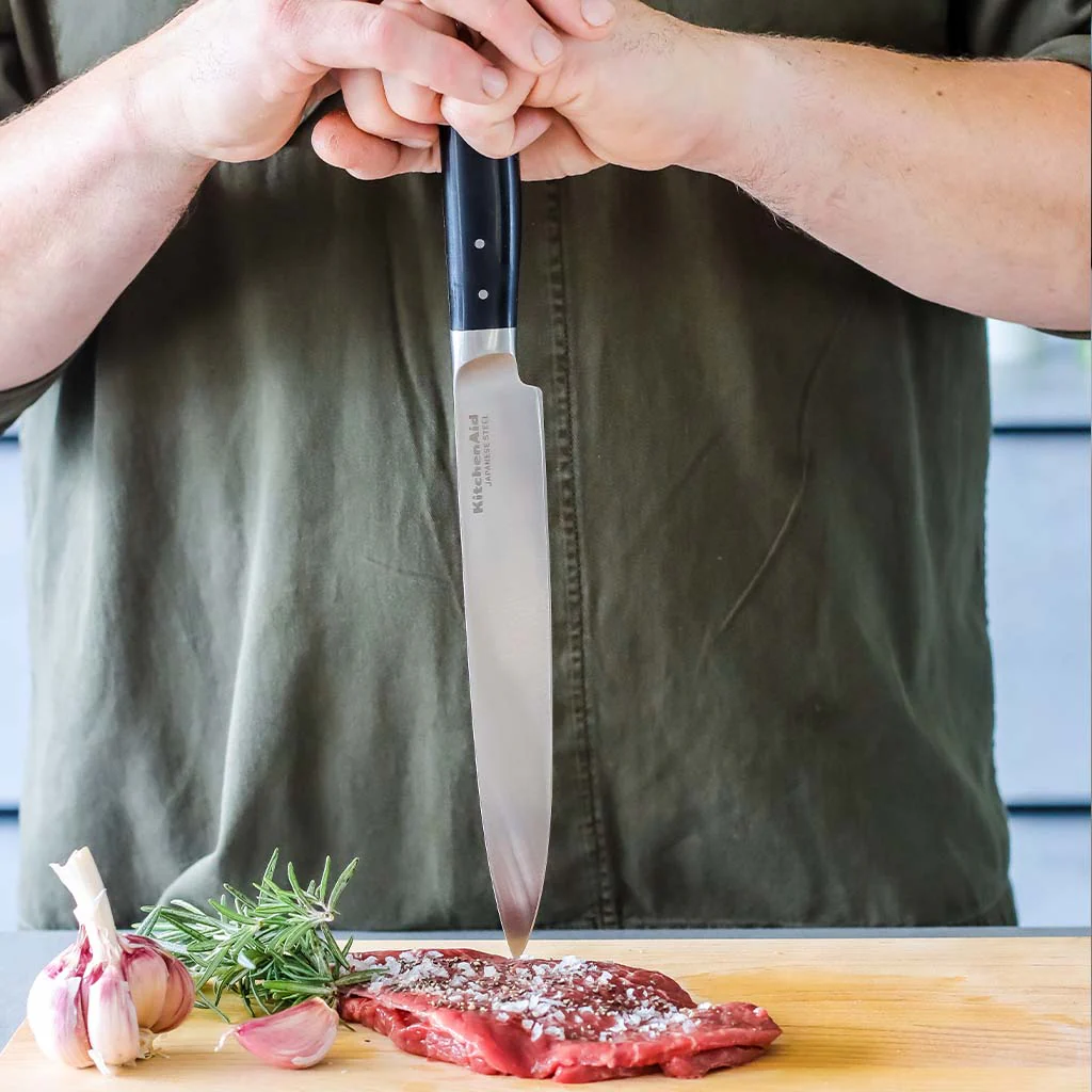 Con los Cuchillos KitchenAid no habrá corte que se resista. La hoja de acero japonés forjado te garantiza un afilado duradero y un corte preciso y su mango ergonómico, con triple remachado, te permitirá un control optimizado en su utilización. Todos los cuchillos se presentan con una funda de seguridad para proteger tanto su hoja como tus dedos.