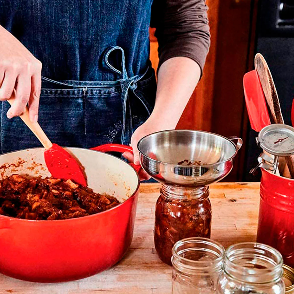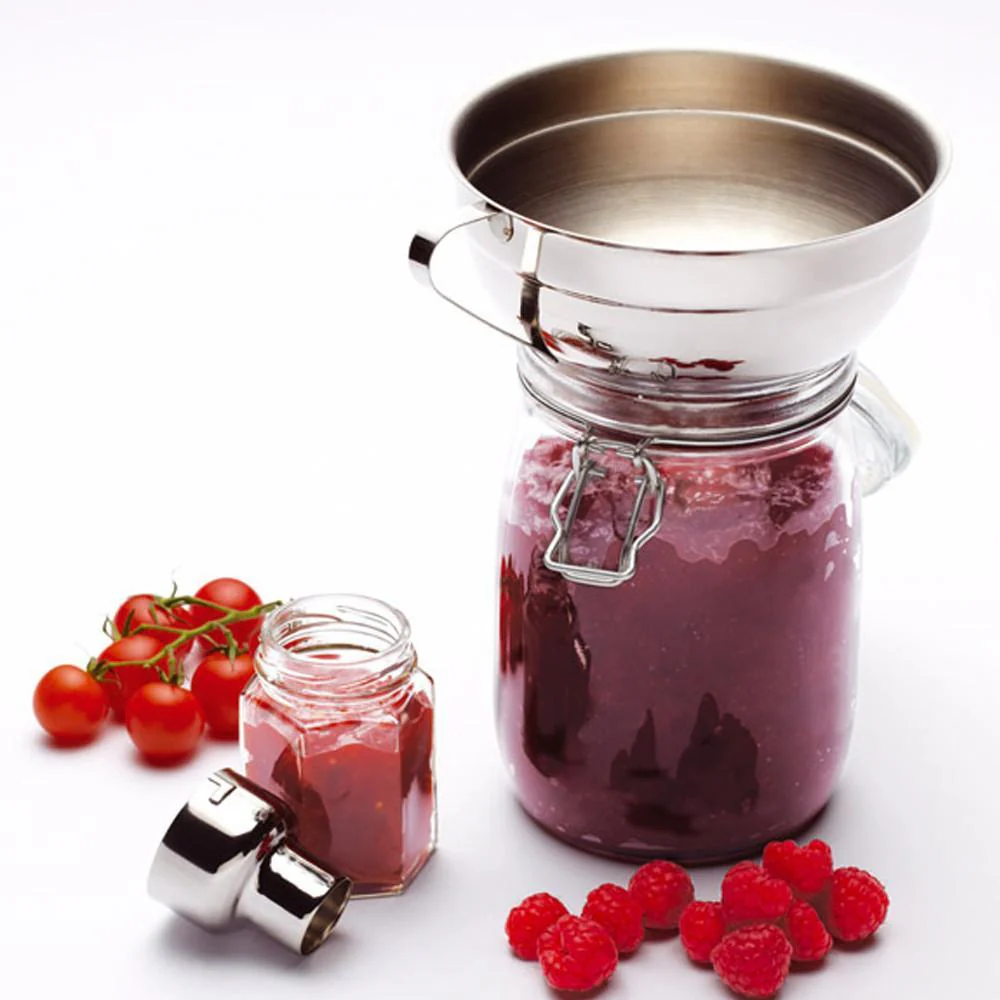 Resulta ideal para verter todo tipo de mermeladas y conservas en tarros, dado que fluyen hacia el bote gracias al amplio cuello del embudo, a pesar de tratarse de preparaciones muy densas o con tropezones grandes.
