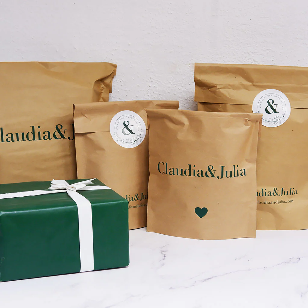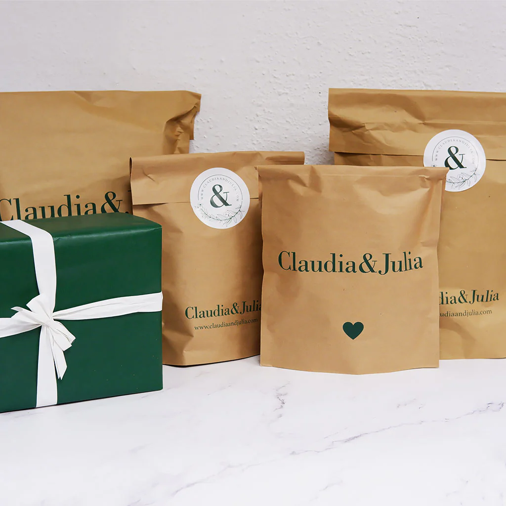 Al finalizar la compra, ofrecemos un producto extra que es el envoltorio para regalo individual. Este envoltorio consta de una bolsa resistente de papel kraft con un diseño personalizado de Claudia&Julia y una etiqueta personalizada también (salvo cambio).