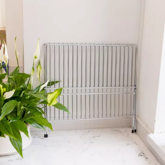 Con su estructura de alambre cromado, este escurridor facilita una circulación óptima del aire alrededor de la vajilla para un secado eficiente. Su diseño minimalista se combina con la tradicional funcionalidad, ofreciendo comodidad sin comprometer el espacio. Además, su capacidad plegable permite un almacenamiento conveniente cuando no está en uso.