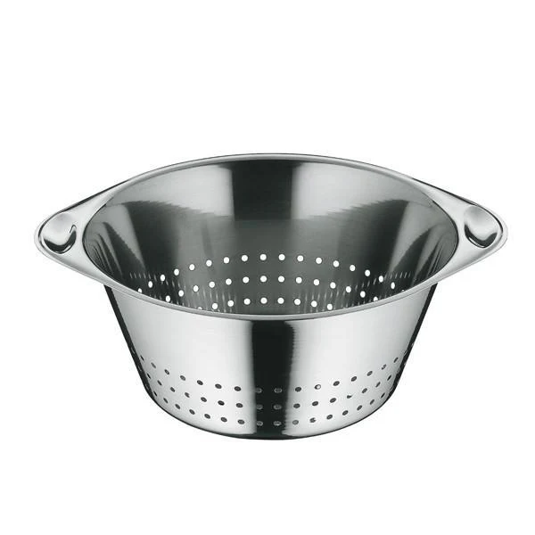 Colador WMF fabricado en acero inoxidable pulido Cromargan 18/10, de 24cm de diámetro. Sus asas, también de acero inoxidable lo hacen cómodo y fácil de coger.