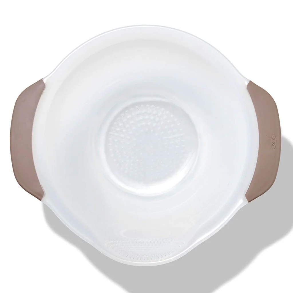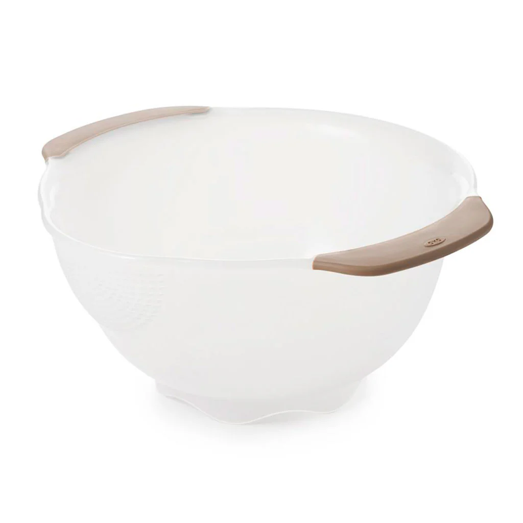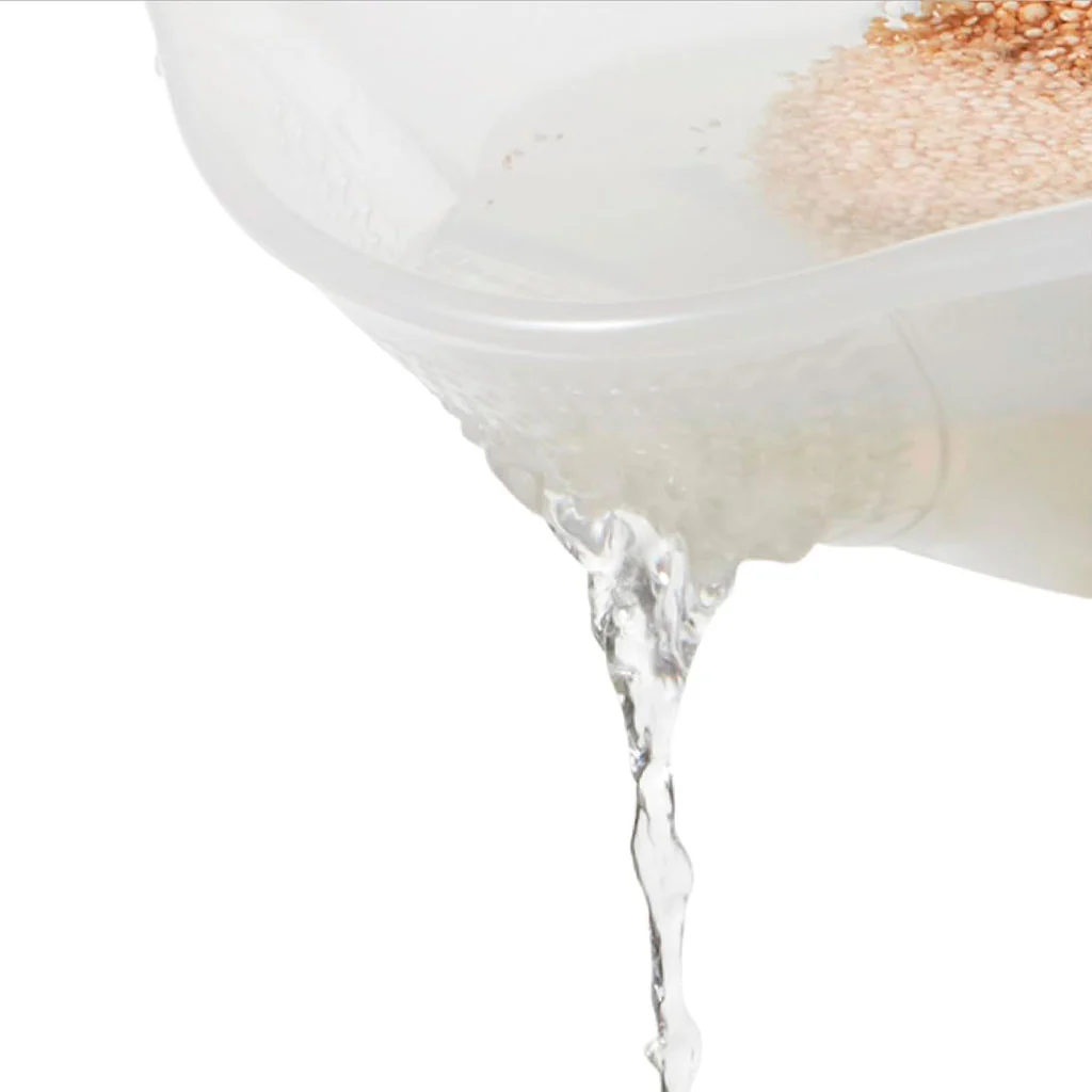 El Escurridor especial para lavar arroces y cereales OXO es un bol con doble colador, diseñado para lavar y escurrir todo tipo de cereales, arroces, pasta o semillas, incluso las más pequeñas, sin perder ni un grano. Dispone de dos zonas perforadas, en la base y en la pared. La base cuenta con diminutos orificios para drenar el agua lentamente mientras las semillas se remojan y limpian o el arroz elimina el almidón, sin que caigan los granos más pequeños. Los agujeros laterales son de mayor tamaño para eliminar el exceso de agua.