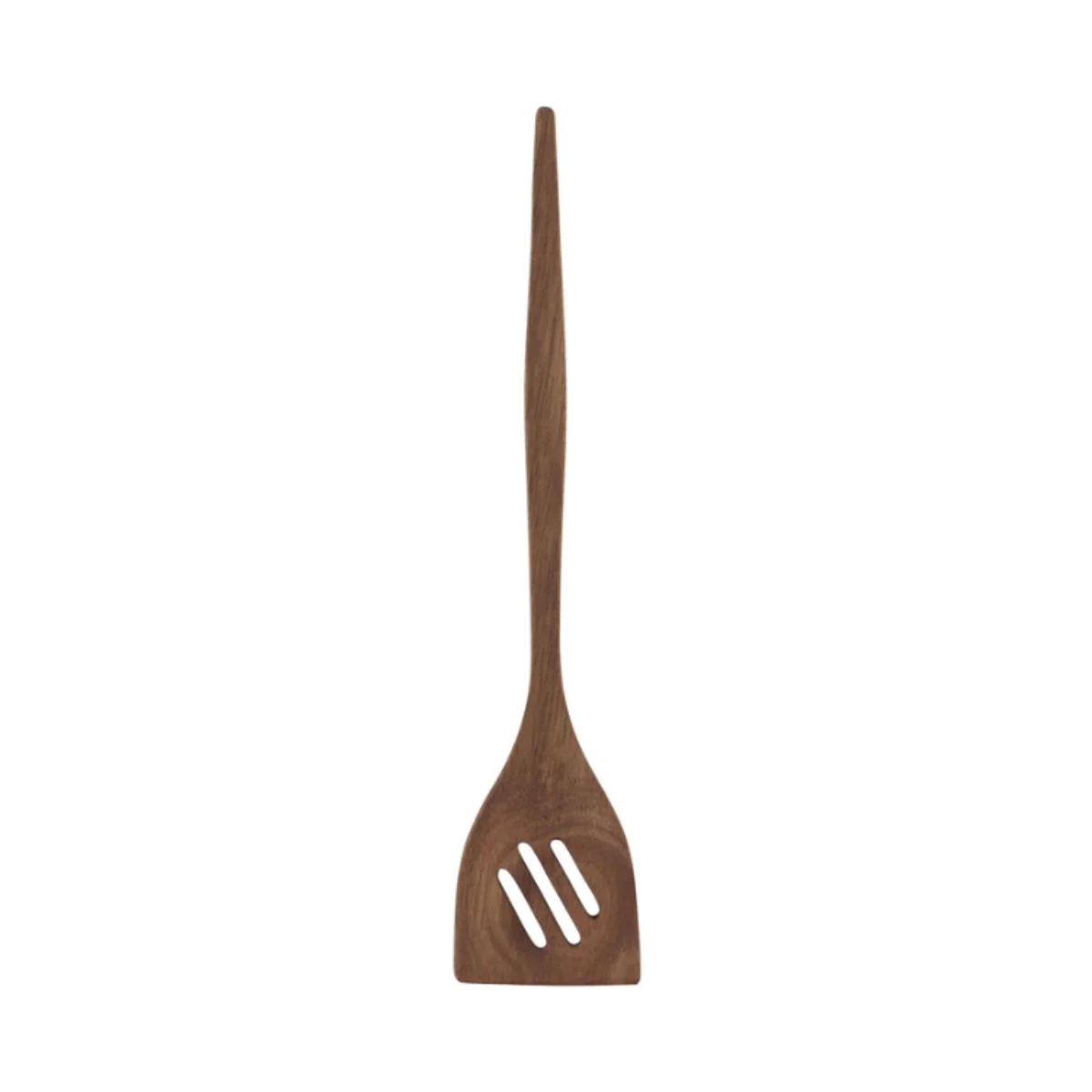 La preciosa veta de la madera hace que cada espátula sea única y le confiere un aspecto natural y cálido. Su construcción en madera de acacia la hace duradera, resistente al desgaste, a la humedad y a las bacterias. Y las ranuras de la pala permiten retirar y servir los alimentos al tiempo que escurre el aceite o los jugos.