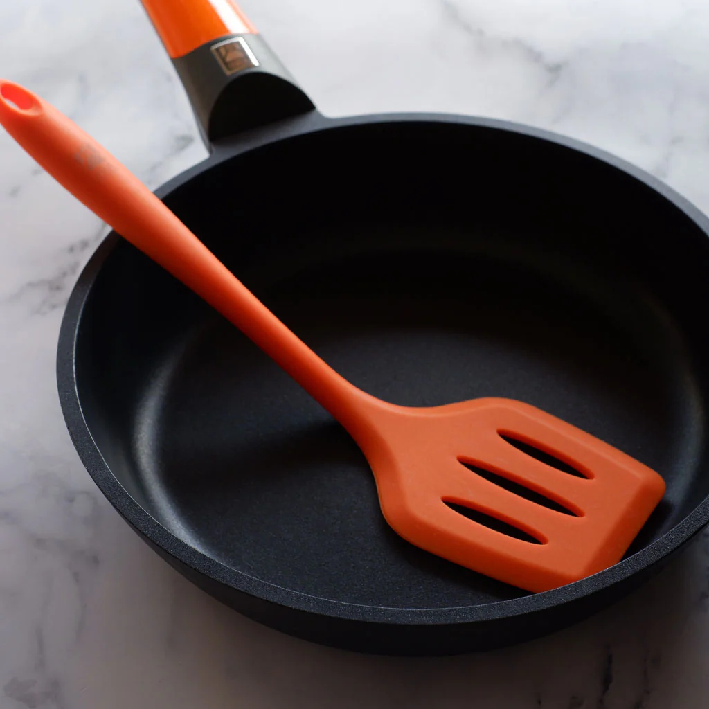 Es una espátula tipo rasera, ideal para manipular alimentos en sartén y en parrilla. De tacto agradable, podrás sostenerla con firmeza y girar tanto piezas pequeñas como grandes con seguridad.